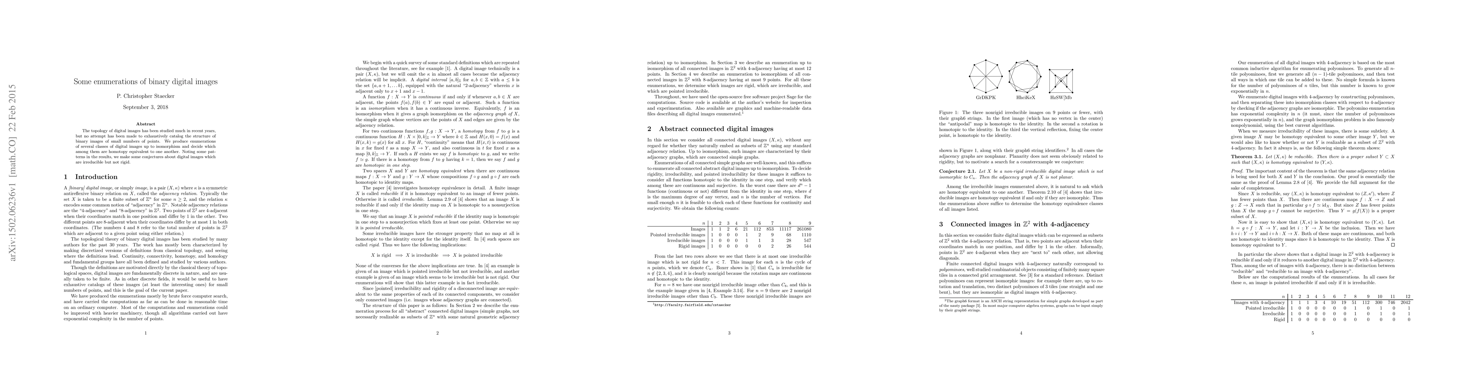 The topology of digital images has been studied much in recent years, but no attempt has been made to exhaustively catalog the structure of binary images of small numbers of points. We produce enumerations of several classes of digital images up to isomorphism and decide which among them are homotopy equivalent to one another. Noting some patterns in the results, we make some conjectures about digital images which are irreducible but not rigid.