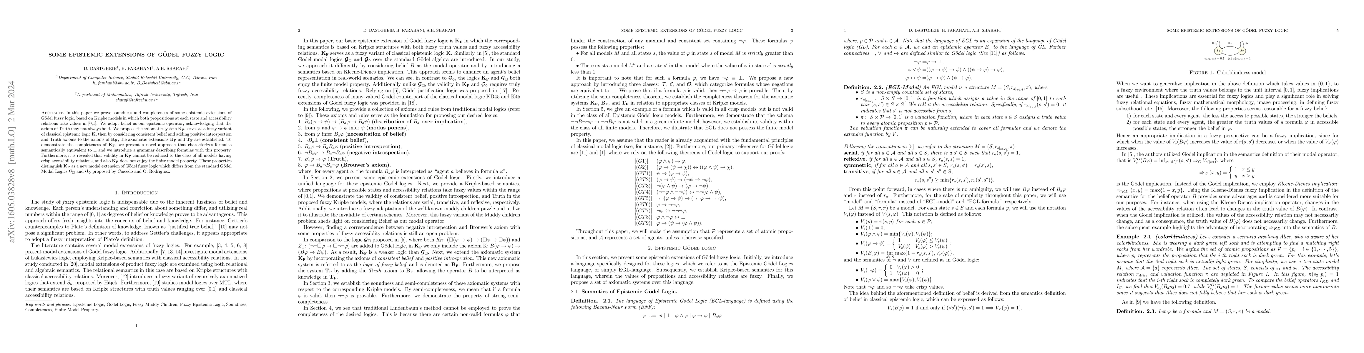 This paper proves soundness and completeness for epistemic extensions of Gödel fuzzy logic, introducing the axiomatic system $\textbf{K}_\textbf{F}$ and its extensions $\textbf{B}_\textbf{F}$ and $\textbf{T}_\textbf{F}$, demonstrating that $\textbf{K}_\textbf{F}$ lacks the finite model property and cannot reduce to crisp accessibility relations.