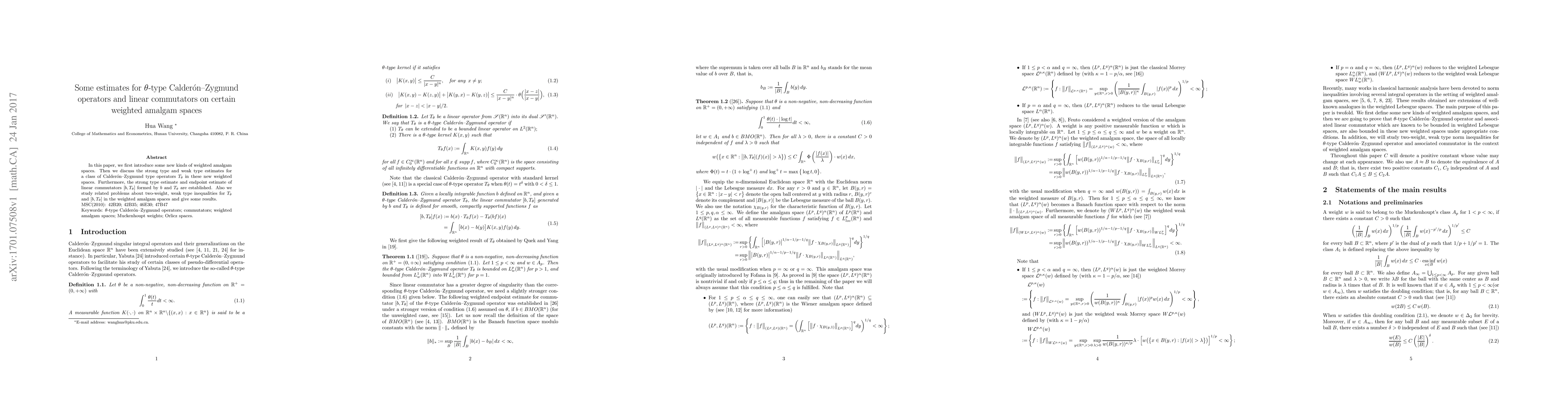 In this paper, we first introduce some new kinds of weighted amalgam spaces. Then we discuss the strong type and weak type estimates for a class of Calder\'on--Zygmund type operators $T_\theta$ in these new weighted spaces. Furthermore, the strong type estimate and endpoint estimate of linear commutators $[b,T_{\theta}]$ formed by $b$ and $T_{\theta}$ are established. Also we study related problems about two-weight, weak type inequalities for $T_{\theta}$ and $[b,T_{\theta}]$ in the weighted amalgam spaces and give some results.
