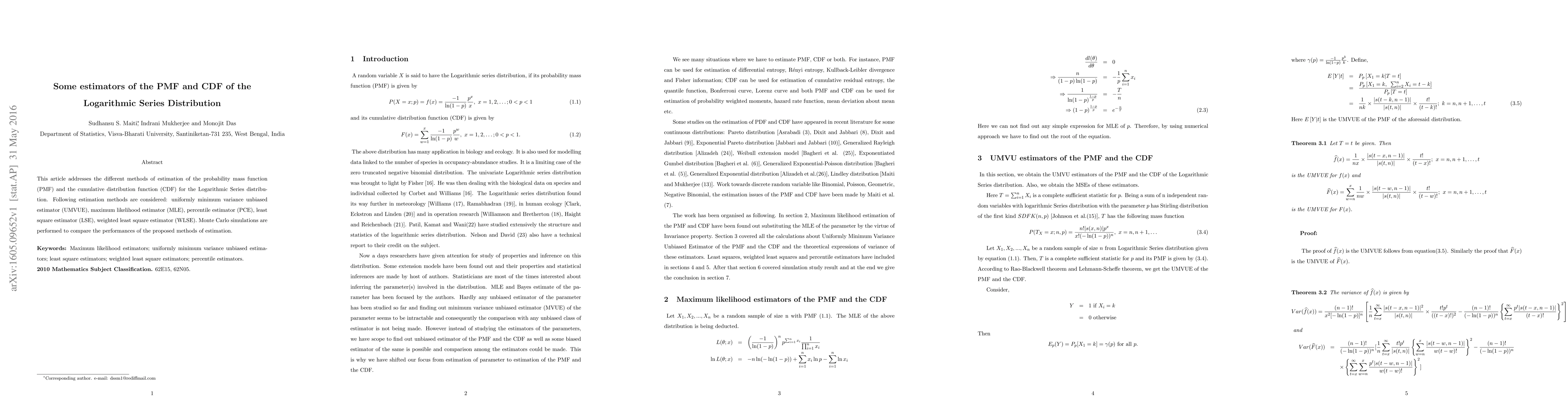 This article addresses the different methods of estimation of the probability mass function (PMF) and the cumulative distribution function (CDF) for the Logarithmic Series distribution. Following estimation methods are considered: uniformly minimum variance unbiased estimator (UMVUE), maximum likelihood estimator (MLE), percentile estimator (PCE), least square estimator (LSE), weighted least square estimator (WLSE). Monte Carlo simulations are performed to compare the performances of the proposed methods of estimation.