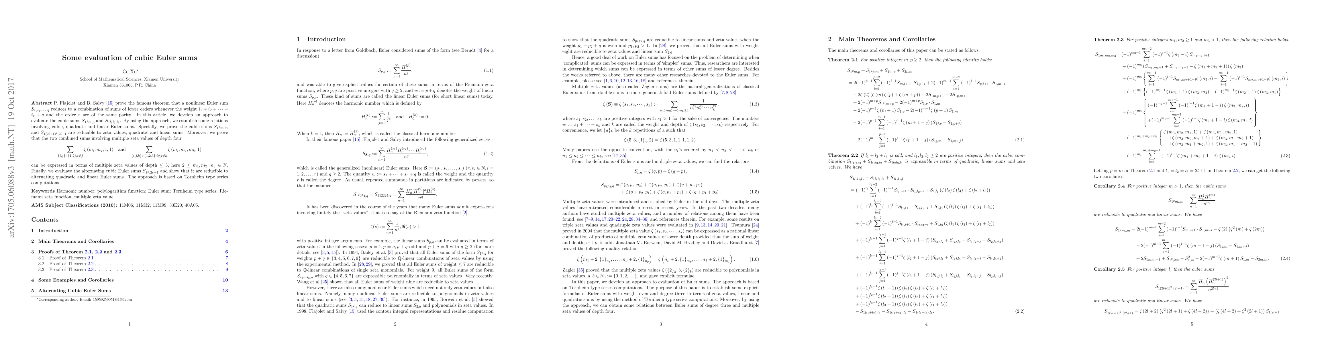 This paper evaluates cubic Euler sums, proving that certain cubic sums reduce to combinations of lower-order sums, zeta values, and linear/quadratic Euler sums. The authors establish relations between cubic, quadratic, and linear sums, and demonstrate the reducibility of specific cubic sums to simpler forms using Tornheim type series computations.