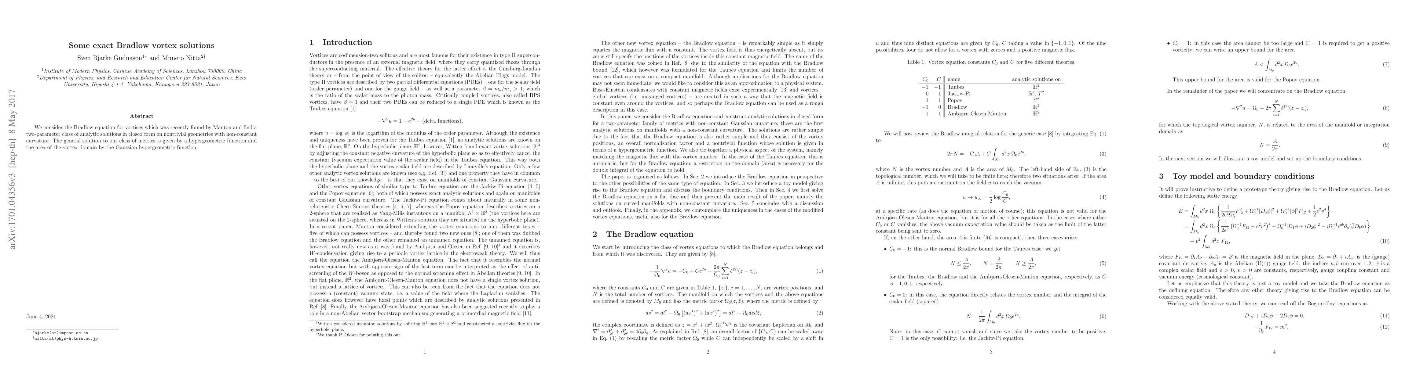 We consider the Bradlow equation for vortices which was recently found by Manton and find a two-parameter class of analytic solutions in closed form on nontrivial geometries with non-constant curvature. The general solution to our class of metrics is given by a hypergeometric function and the area of the vortex domain by the Gaussian hypergeometric function.