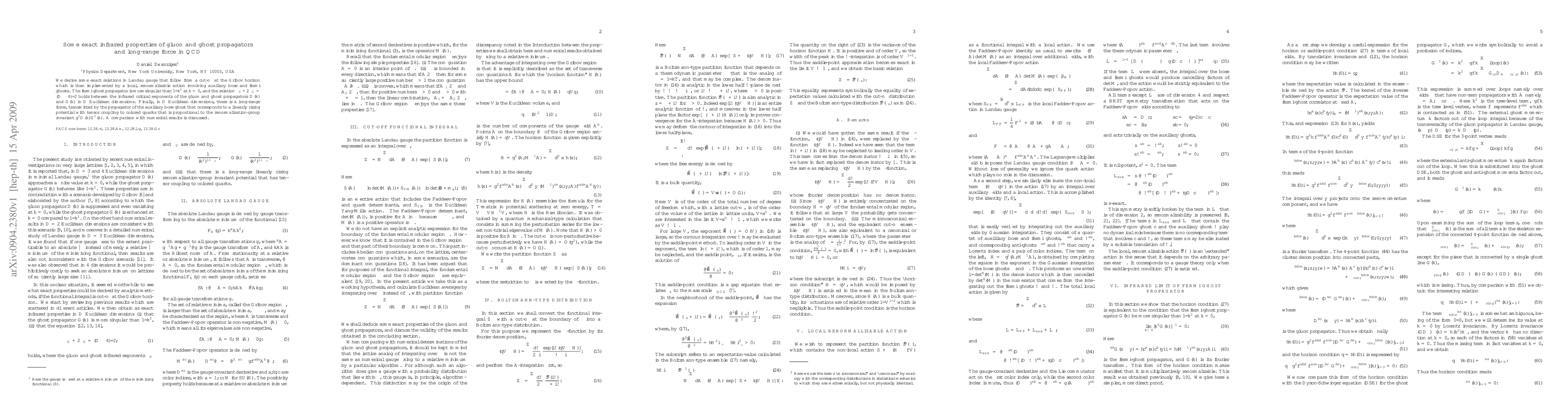 This paper derives exact relations in the Landau gauge for QCD, showing that the fermi ghost propagator is more singular than $1/k^2$ at $k = 0$ and establishes a relation between the infrared critical exponents of gluon and ghost propagators. It also reveals a long-range force transmitted by the auxiliary bose ghost propagator, leading to a linearly rising potential proportional to $g^2 D(k) G^2(k)$.