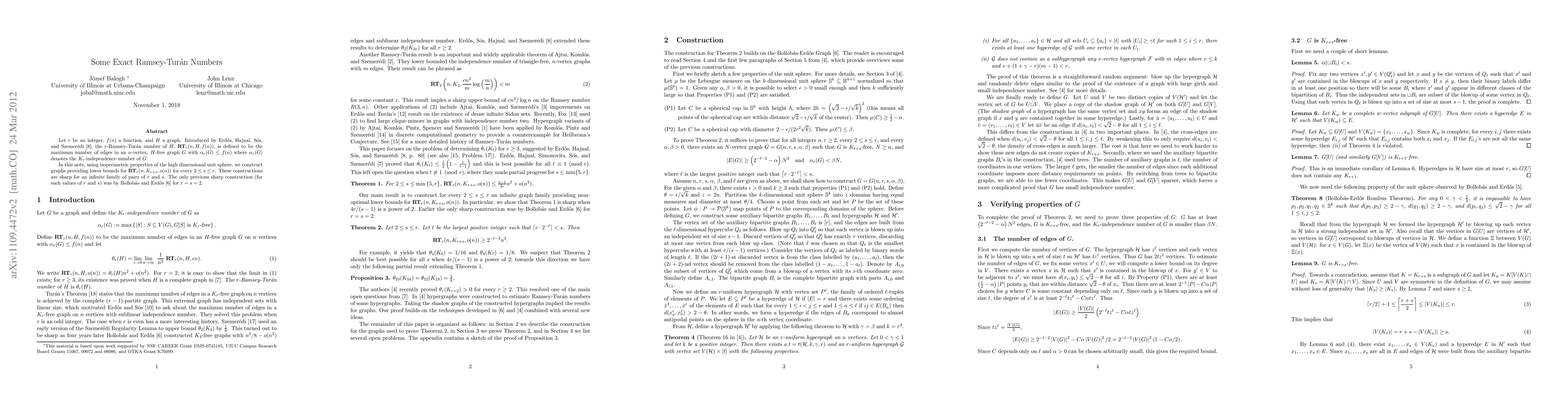 Let r be an integer, f(n) a function, and H a graph. Introduced by Erd\H{o}s, Hajnal, S\'{o}s, and Szemer\'edi, the r-Ramsey-Tur\'{a}n number of H, RT_r(n, H, f(n)), is defined to be the maximum number of edges in an n-vertex, H-free graph G with \alpha_r(G) <= f(n) where \alpha_r(G) denotes the K_r-independence number of G. In this note, using isoperimetric properties of the high dimensional unit sphere, we construct graphs providing lower bounds for RT_r(n,K_{r+s},o(n)) for every 2 <= s <= r. These constructions are sharp for an infinite family of pairs of r and s. The only previous sharp construction was by Bollob\'as and Erd\Hos for r = s = 2.