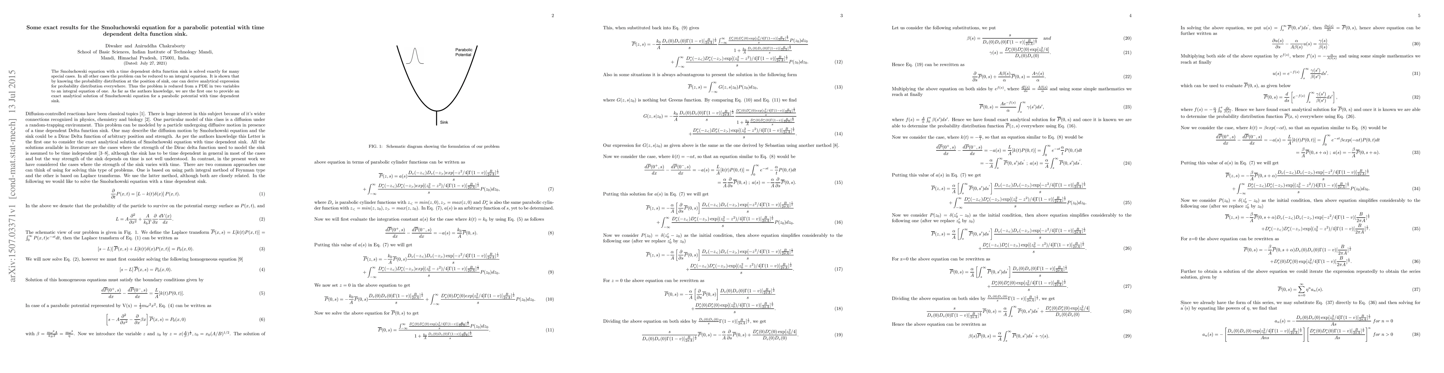 This paper presents exact analytical solutions for the Smoluchowski equation under a parabolic potential with a time-dependent delta function sink, reducing the problem from a PDE to an integral equation. The authors claim to be the first to achieve this exact solution for such conditions.