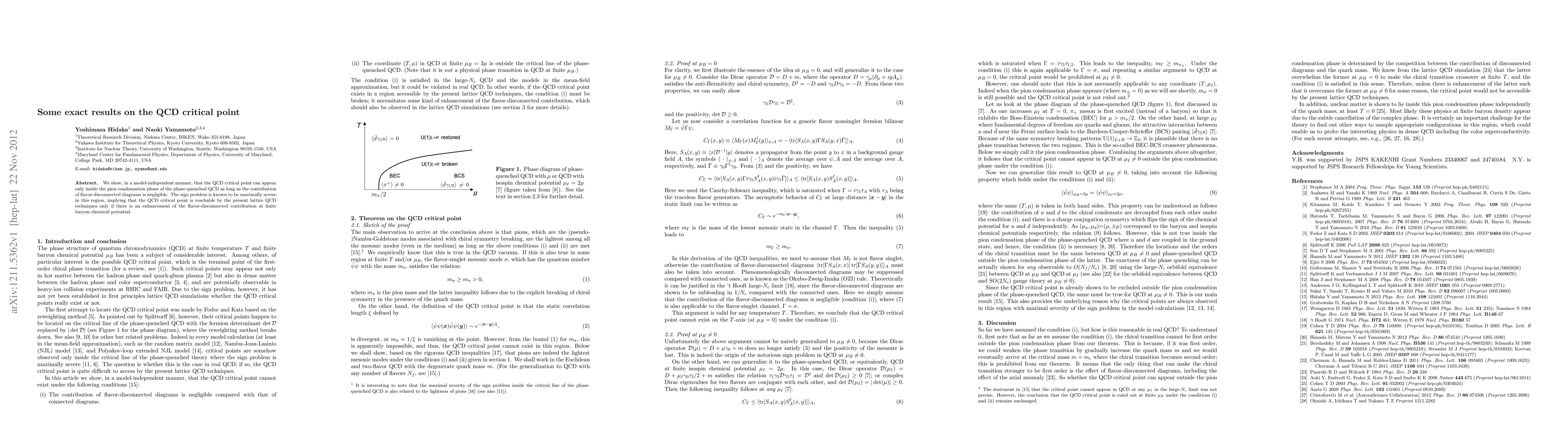 We show, in a model-independent manner, that the QCD critical point can appear only inside the pion condensation phase of the phase-quenched QCD as long as the contribution of flavor-disconnected diagrams is negligible. The sign problem is known to be maximally severe in this region, implying that the QCD critical point is reachable by the present lattice QCD techniques only if there is an enhancement of the flavor-disconnected contribution at finite baryon chemical potential.