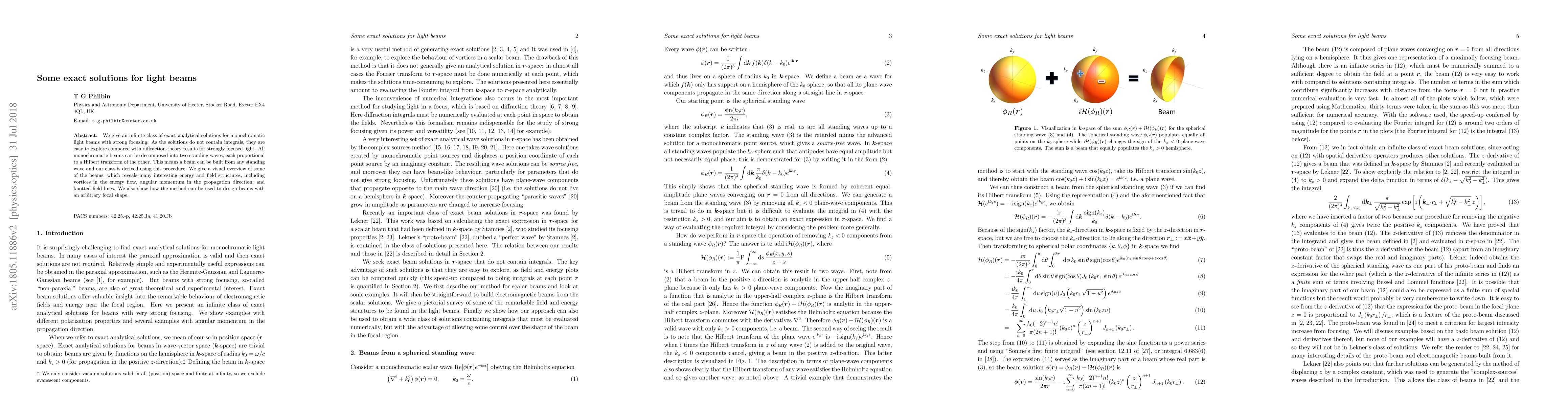 The paper presents an infinite class of exact analytical solutions for strongly focused monochromatic light beams, decomposed into standing waves, revealing intriguing energy structures and angular momentum. The solutions facilitate the design of beams with customizable focal shapes.