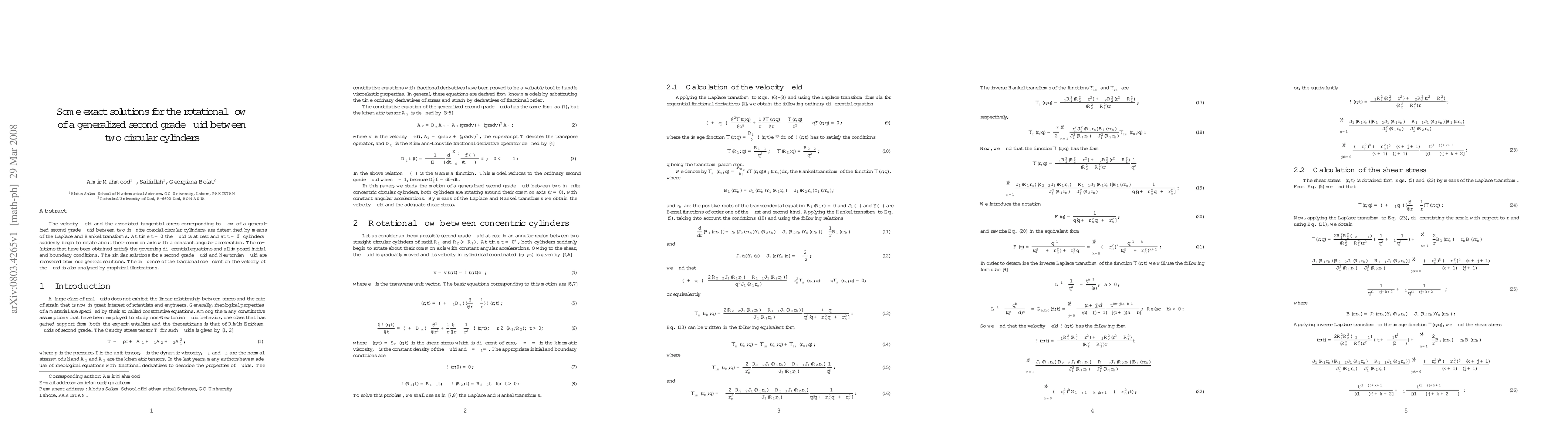 This paper derives exact solutions for the rotational flow of a generalized second grade fluid between two infinite coaxial circular cylinders using Laplace and Hankel transforms. The solutions satisfy governing differential equations and initial/boundary conditions, and include comparisons to second grade fluid and Newtonian fluid behaviors, with graphical analysis of the fractional coefficient's influence on fluid velocity.