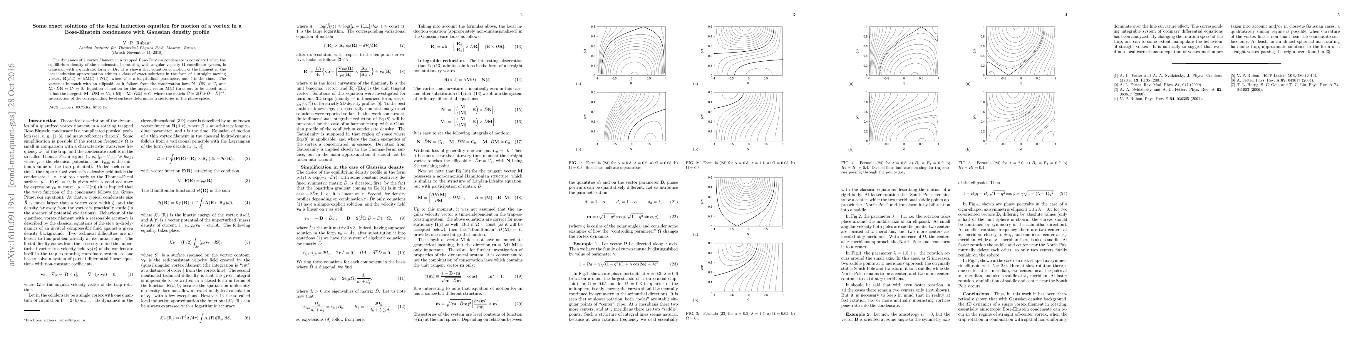 The dynamics of a vortex filament in a trapped Bose-Einstein condensate is considered when the equilibrium density of the condensate, in rotating with angular velocity ${\bf\Omega}$ coordinate system, is Gaussian with a quadratic form ${\bf r}\cdot\hat D{\bf r}$. It is shown that equation of motion of the filament in the local induction approximation admits a class of exact solutions in the form of a straight moving vortex, ${\bf R}(\beta,t)=\beta {\bf M}(t) +{\bf N}(t)$, where $\beta$ is a longitudinal parameter, and $t$ is the time. The vortex is in touch with an ellipsoid, as it follows from the conservation laws ${\bf N}\cdot \hat D {\bf N}=C_1$ and ${\bf M}\cdot \hat D {\bf N}=C_0=0$. Equation of motion for the tangent vector ${\bf M}(t)$ turns out to be closed, and it has the integrals ${\bf M}\cdot \hat D {\bf M}=C_2$, $(|{\bf M}| -{\bf M}\cdot\hat G{\bf \Omega})=C$, where the matrix $\hat G=2(\hat I \mbox{Tr\,} \hat D -\hat D)^{-1}$. Intersection of the corresponding level surfaces determines trajectories in the phase space.