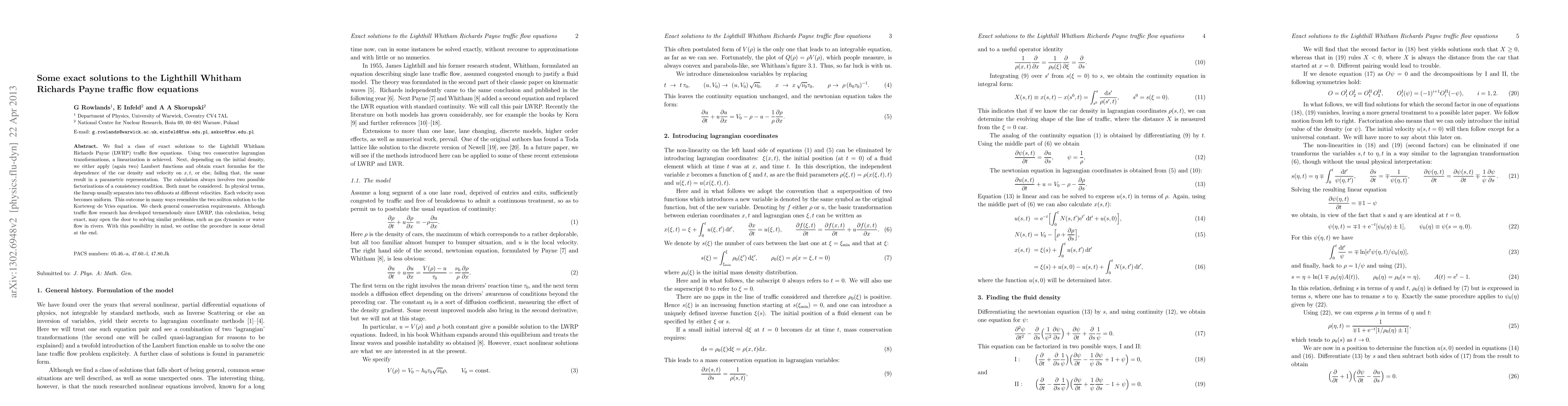 We find a class of exact solutions to the Lighthill Whitham Richards Payne (LWRP) traffic flow equations. Using two consecutive lagrangian transformations, a linearization is achieved. Next, depending on the initial density, we either apply (again two) Lambert functions and obtain exact formulas for the dependence of the car density and velocity on x and t, or else, failing that, the same result in a parametric representation. The calculation always involves two possible factorizations of a consistency condition. Both must be considered. In physical terms, the lineup usually separates into two offshoots at different velocities. Each velocity soon becomes uniform. This outcome in many ways resembles the two soliton solution to the Korteweg-de Vries equation. We check general conservation requirements. Although traffic flow research has developed tremendously since LWRP, this calculation, being exact, may open the door to solving similar problems, such as gas dynamics or water flow in rivers. With this possibility in mind, we outline the procedure in some detail at the end.