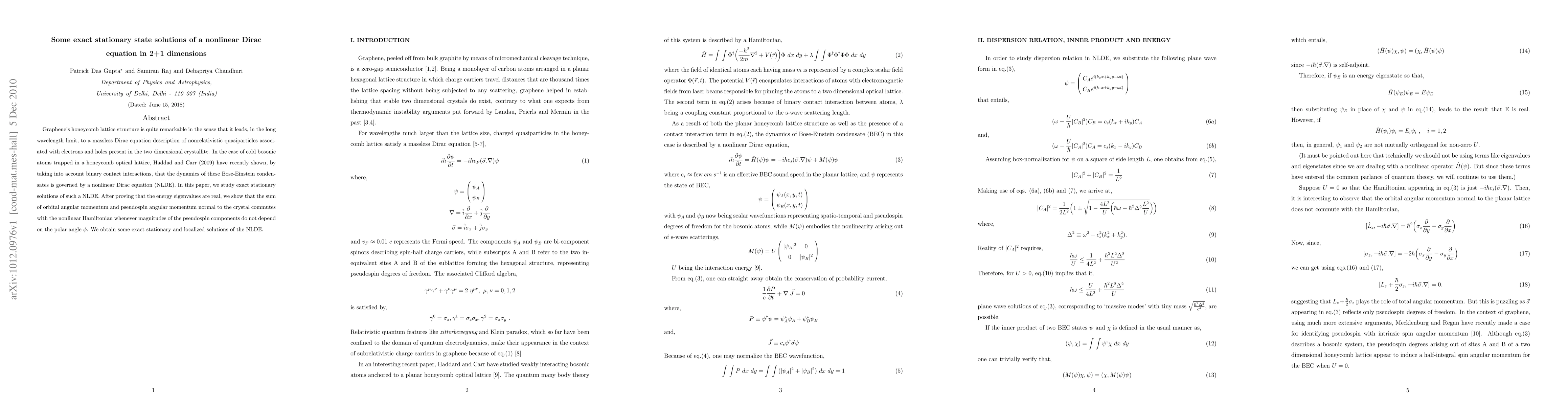 Graphene's honeycomb lattice structure is quite remarkable in the sense that it leads, in the long wavelength limit, to a massless Dirac equation description of nonrelativistic quasiparticles associated with electrons and holes present in the two dimensional crystallite. In the case of cold bosonic atoms trapped in a honeycomb optical lattice, Haddad and Carr (2009) have recently shown, by taking into account binary contact interactions, that the dynamics of these Bose-Einstein condensates is governed by a nonlinear Dirac equation (NLDE). In this paper, we study exact stationary solutions of such a NLDE. After proving that the energy eigenvalues are real, we show that the sum of orbital angular momentum and pseudospin angular momentum normal to the crystal commutes with the nonlinear Hamiltonian whenever magnitudes of the pseudospin components do not depend on the polar angle $\phi $. We obtain some exact stationary and localized solutions of the NLDE.