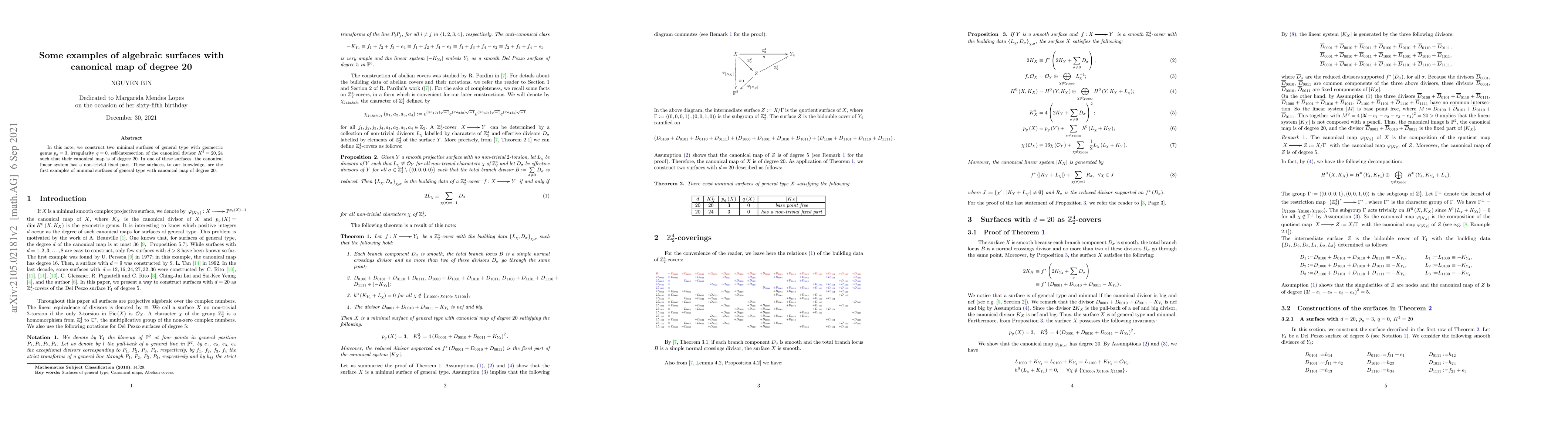 This paper constructs two minimal surfaces of general type with specific geometric properties, including a canonical map of degree 20, marking the first known examples of such surfaces. One surface features a non-trivial fixed part in its canonical linear system.