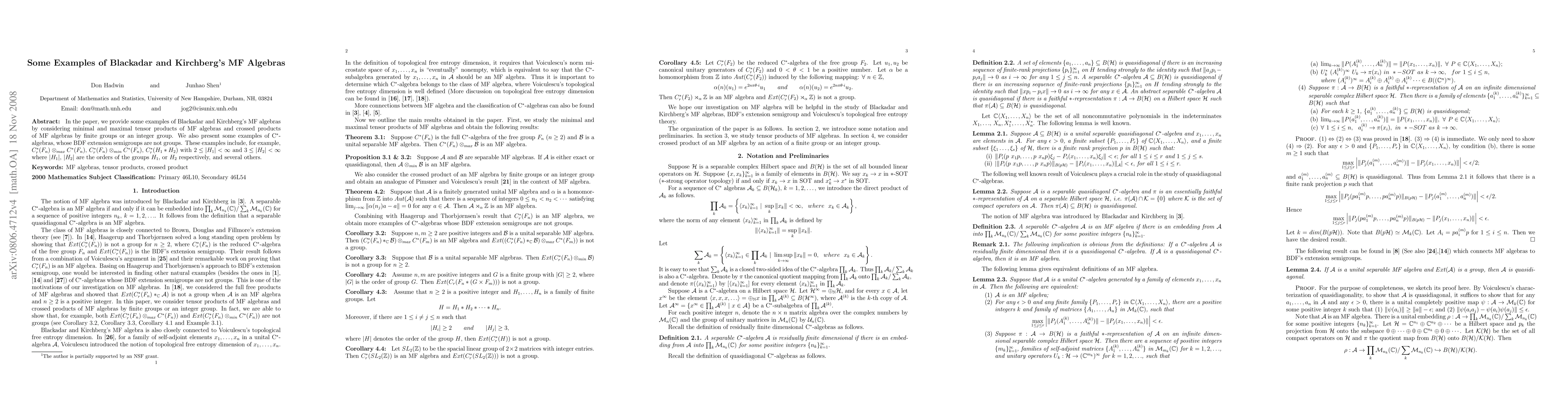 This paper explores examples of MF algebras through tensor products and crossed products, including specific instances like $C_r^*(F_n)\otimes_{max} C^*(F_n)$ and $C_r^*(H_1\ast H_2)$, demonstrating cases where the BDF extension semigroup is not a group.