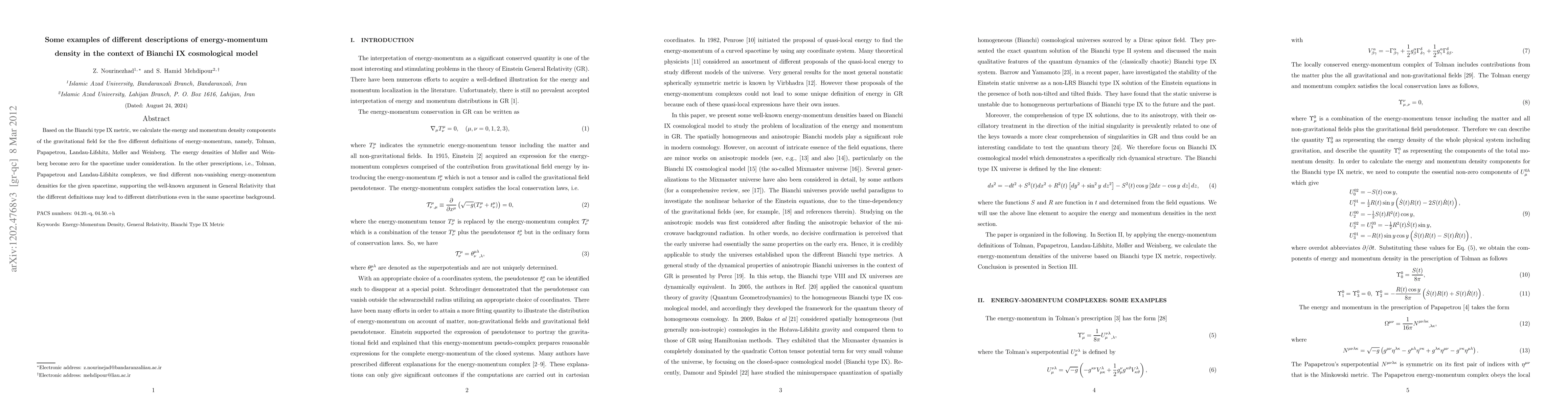 Based on the Bianchi type IX metric, we calculate the energy and momentum density components of the gravitational field for the five different definitions of energy-momentum, namely, Tolman, Papapetrou, Landau-Lifshitz, M{\o}ller and Weinberg. The energy densities of M{\o}ller and Weinberg become zero for the spacetime under consideration. In the other prescriptions, i.e., Tolman, Papapetrou and Landau-Lifshitz complexes, we find different non-vanishing energy-momentum densities for the given spacetime, supporting the well-known argument in General Relativity that the different definitions may lead to different distributions even in the same spacetime background.