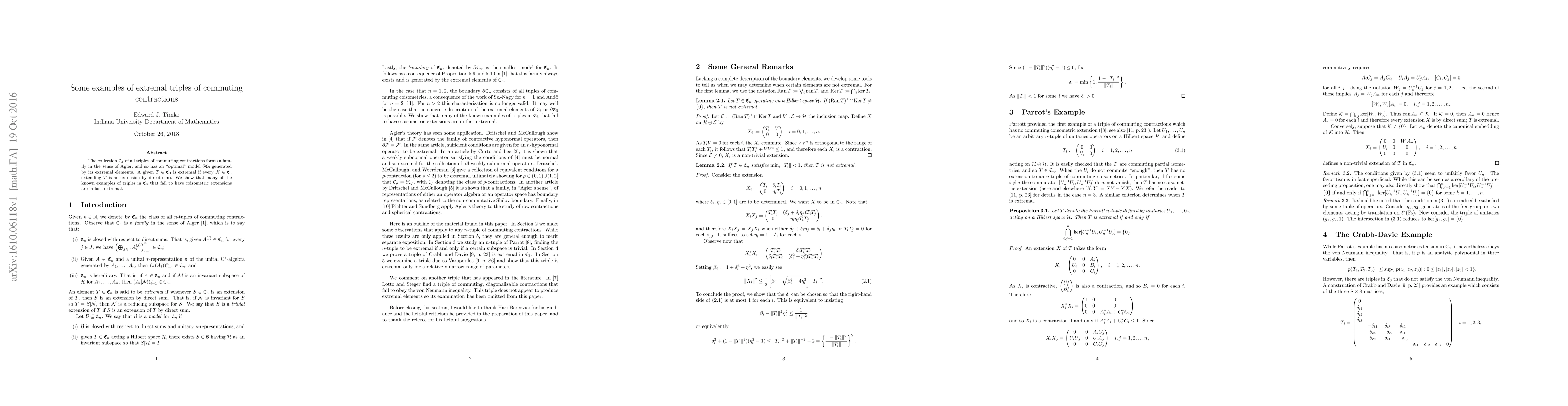 The collection $\frk{C}_3$ of all triples of commuting contractions forms a family in the sense of Agler, and so has an "optimal" model $\pd\frk{C}_3$ generated by its extremal elements. A given $T\in\frk{C}_3$ is extremal if every $X\in\frk{C}_3$ extending $T$ is an extension by direct sum. We show that many of the known examples of triples in $\frk{C}_3$ that fail to have coisometric extensions are in fact extremal.