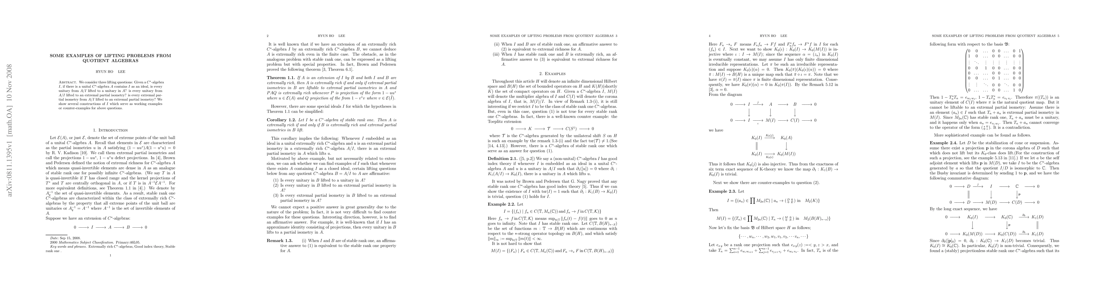 We consider three lifting questions: Given a $C\sp{*}$-algebra $I$, if there is a unital $C\sp{*}$-algebra $A$ contains $I$ as an ideal, is every unitary from $A/I$ lifted to a unitary in $A$? is every unitary from $A/I$ lifted to an extremal partial isometry? is every extremal partial isometry from $A/I$ lifted to an extremal partial isometry? We show several constructions of $I$ which serve as working examples or counter-examples for above questions.