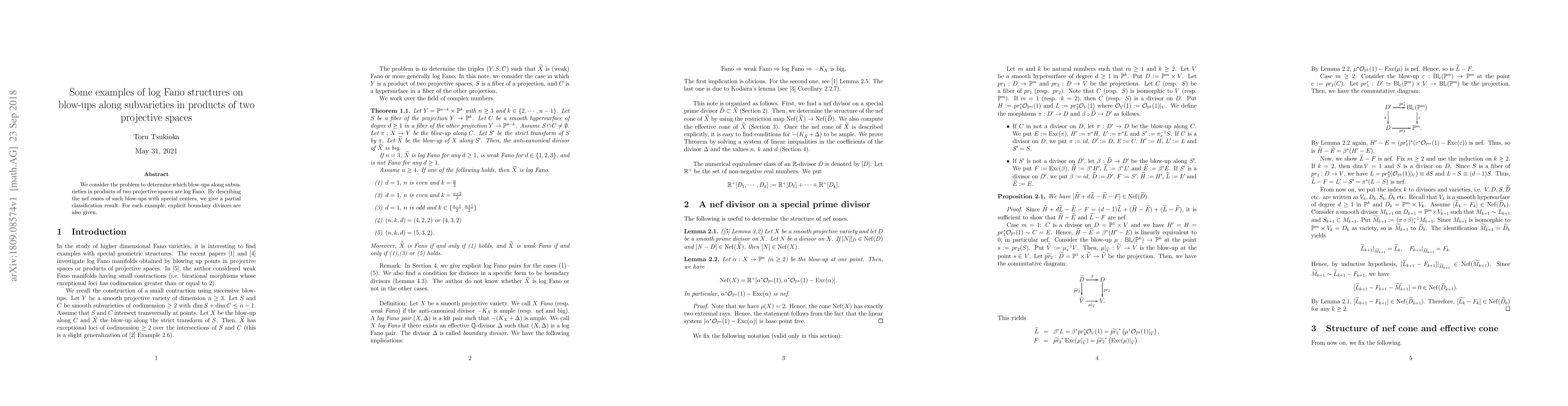 Title: Some examples of log Fano structures on blow-ups along subvarieties in products of two projective spaces Summary: This paper explores which blow-ups along subvarieties in products of two projective spaces are log Fano, providing a partial classification through descriptions of nef cones and explicit boundary divisors for each example.