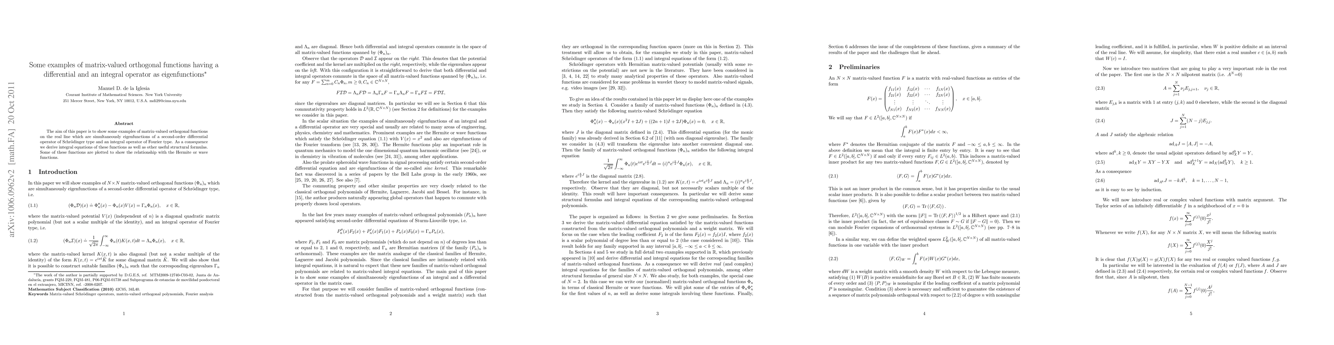 This paper finds examples of matrix-valued orthogonal functions that are eigenfunctions for both a Schrödinger differential operator and a Fourier integral operator, leading to new integral representations and structural formulas.