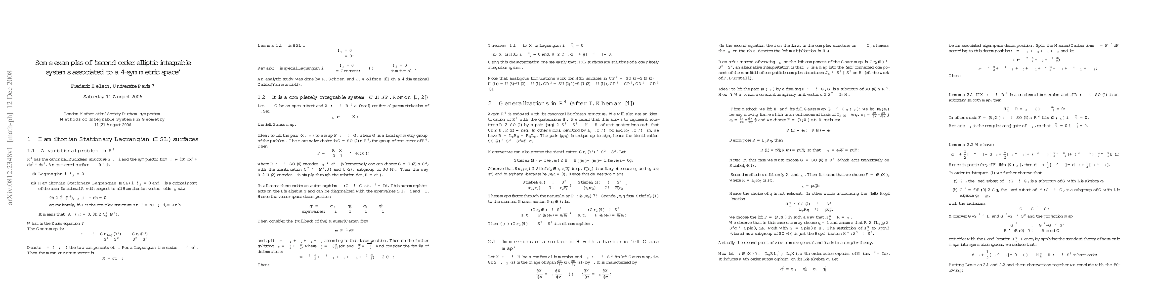 In this text we expound recent results by Idrisse Khemar on the construction of various geometric completely integrable systems generalizing the structure of Hamiltonian stationary Lagrangian surfaces (HSLS) discovered by F. H\'elein and P. Romon. We first explain that, for surfaces in a 4-dimensional Euclidean space, the HSLS are a particular case of a more general theory of surfaces with harmonic left Gauss map and that this theory includes also the classical constant mean curvature surfaces in 3-space. Then we expound a generalization of this theory for surfaces in an 8-dimensional Euclidean space, using octonions. Lastly we discuss supersymmetric harmonic and primitive maps, a theory which also covers the HSLS cas.
