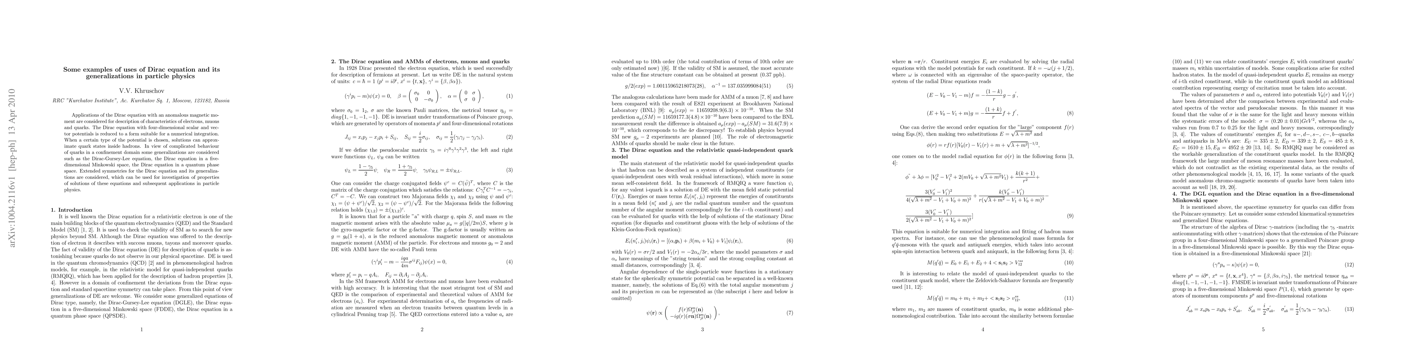 Applications of the Dirac equation with an anomalous magnetic moment are considered for description of characteristics of electrons, muons and quarks. The Dirac equation with four-dimensional scalar and vector potentials is reduced to a form suitable for a numerical integration. When a certain type of the potential is chosen, solutions can approximate quark states inside hadrons. In view of complicated behaviour of quarks in a confinement domain some generalizations are considered such as the Dirac-Gursey-Lee equation, the Dirac equation in a five-dimensional Minkowski space, the Dirac equation in a quantum phase space. Extended symmetries for the Dirac equation and its generalizations are considered, which can be used for investigation of properties of solutions of these equations and subsequent applications in particle physics.