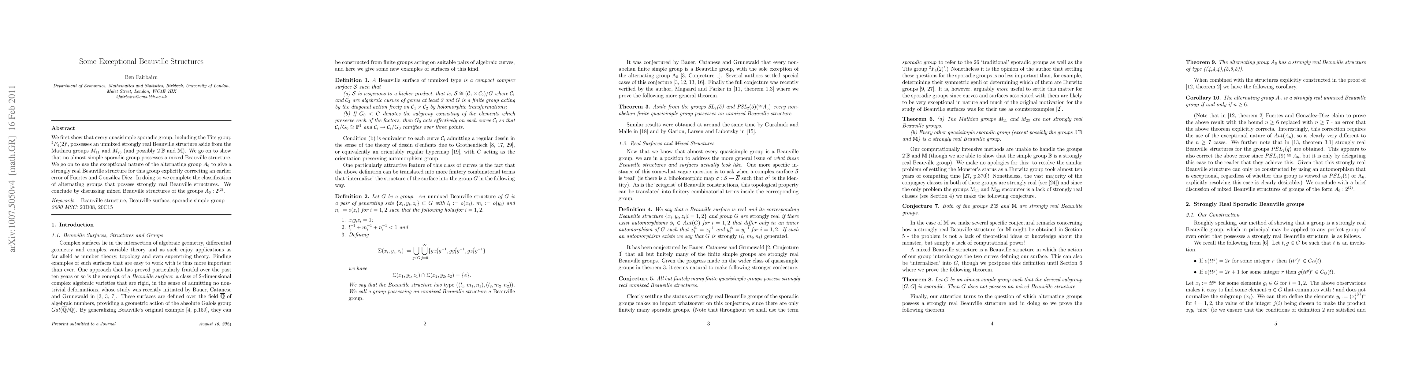 We first show that every quasisimple sporadic group possesses an unmixed strongly real Beauville structure aside from the Mathieu groups M11 and M23 (and possibly 2B and M). We go on to show that no almost simple sporadic group possesses a mixed Beauville structure. We then go on to use the exceptional nature of the alternating group A6 to give a strongly real Beauville structure for this group explicitly correcting an earlier error of Fuertes and Gonzalez-Diez. In doing so we complete the classification of alternating groups that possess strongly real Beauville structures. We conclude by discussing mixed Beauville structures of the groups A6:2 and A6:2^2.