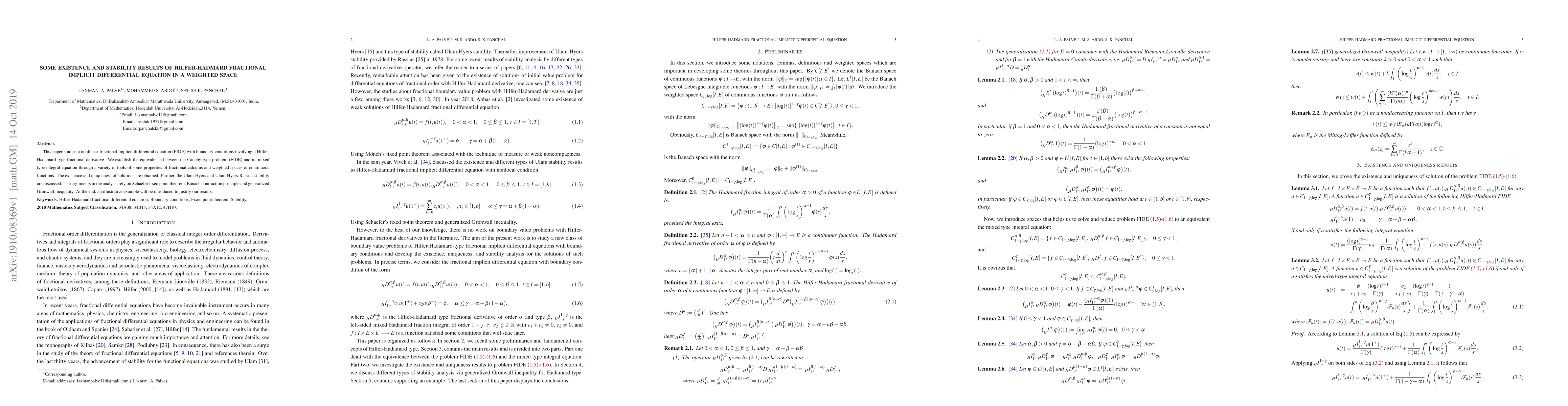 This paper studies a nonlinear fractional implicit differential equation (FIDE) with boundary conditions involving a HilferHadamard type fractional derivative. We establish the equivalence between the Cauchy-type problem (FIDE) and its mixed type integral equation through a variety of tools of some properties of fractional calculus and weighted spaces of continuous functions. The existence and uniqueness of solutions are obtained. Further, the Ulam-Hyers and Ulam-Hyers-Rassias stability are discussed. The arguments in the analysis rely on Schaefer fixed point theorem, Banach contraction principle and generalized Gronwall inequality. At the end, an illustrative example will be introduced to justify our results