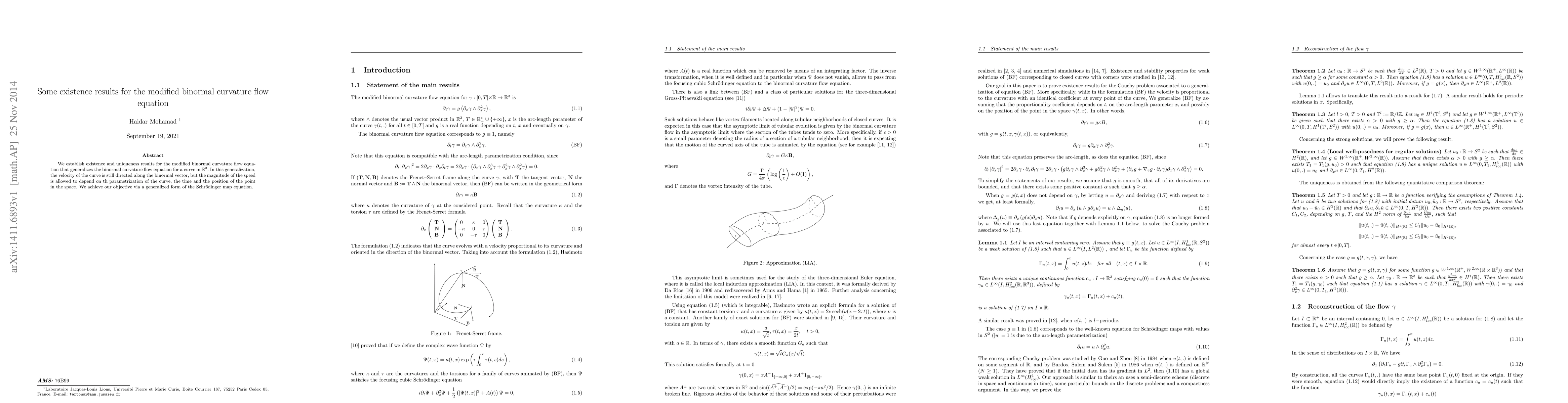 This paper establishes existence and uniqueness for a modified binormal curvature flow equation, where the flow velocity is directed along the binormal vector but varies based on curve parametrization, time, and spatial position, using a generalized Schrödinger map equation.