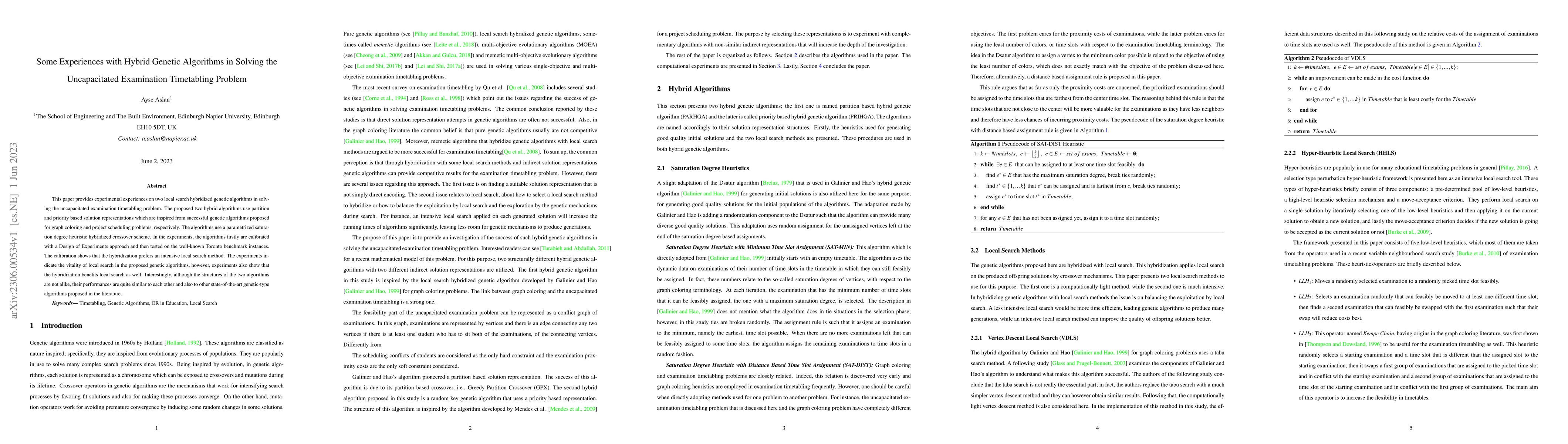 This paper explores two hybrid genetic algorithms for solving the uncapacitated examination timetabling problem, demonstrating the effectiveness of local search hybridized crossover. The algorithms show similar performance to other state-of-the-art methods, indicating that hybridization enhances local search efficiency.
