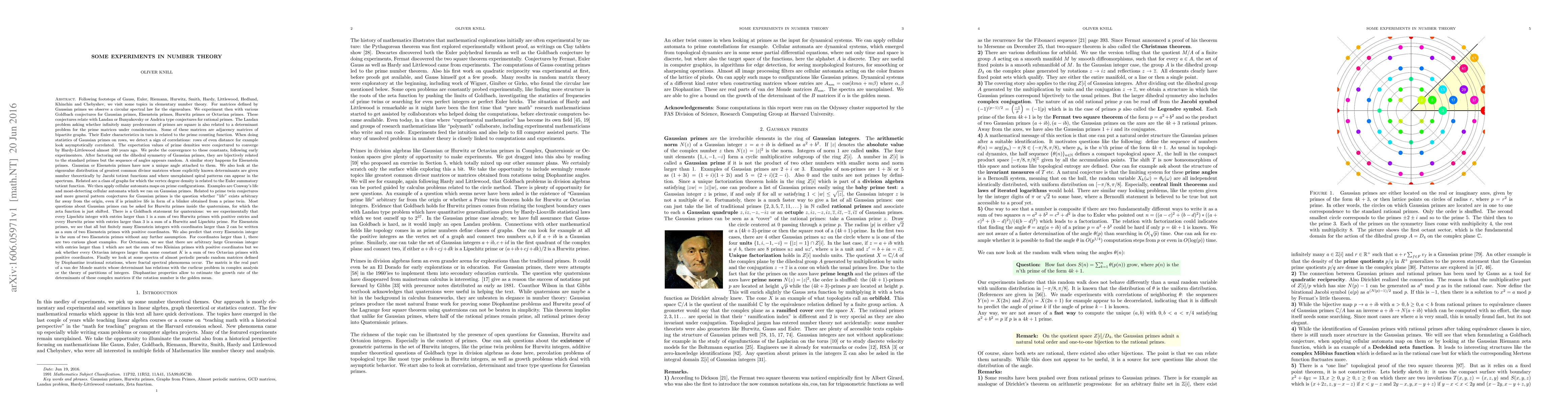 We experiment with some topics in elementary number theory. For matrices defined by Gaussian primes we observe a circular spectral law for the eigenvalues. We look at matrices defined by Gaussian primes and look at the growth of the determinant, trace. We experiment with various Goldbach conjectures for Gaussian primes, Eisenstein primes, Hurwitz primes or Octavian primes. These conjectures relate with Landau or Bunyakovsky or Andrica type conjectures for rational primes. We also look at some graphs finite simple defined by primes. Finally we look at some spectra of almost periodic pseudo random matrices defined by Diophantine irrational rotations, where fractal spectral phenomena occur. The matrix is the real part of a van der Monde matrix.