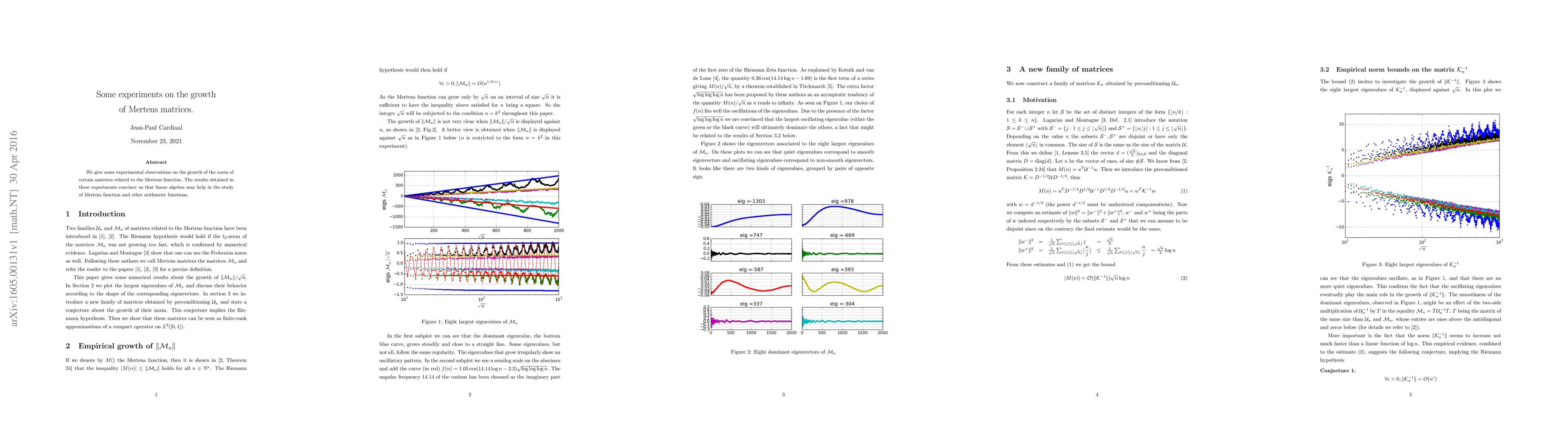 Summary: This paper presents experimental observations on the growth of Mertens matrices' norms, suggesting that linear algebra techniques could aid in studying the Mertens function and related arithmetic functions. The findings indicate a potential new direction for mathematical research in this area.