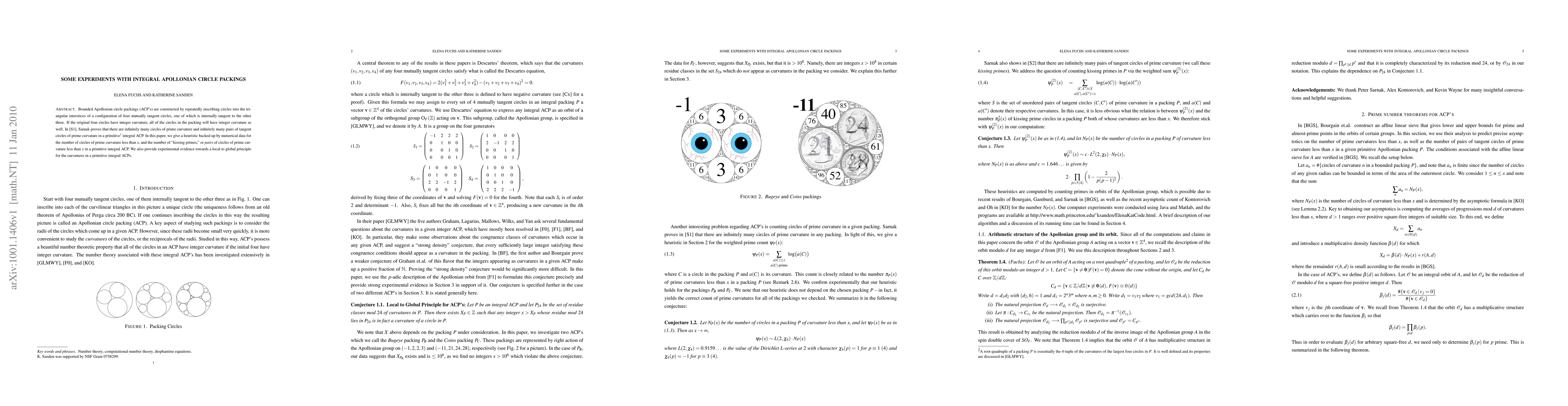 Researchers explored bounded Apollonian circle packings, finding evidence for a local to global principle on curvatures and providing numerical data on prime curvature circles and kissing primes in such packings.