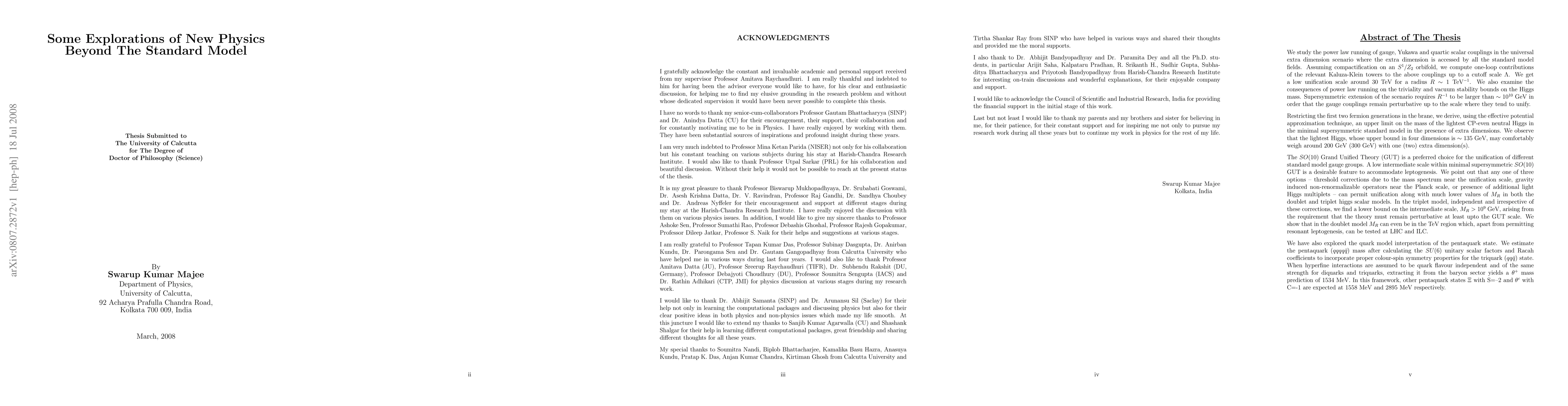 Some new physics beyond the Standard Model of particle physics, like Supersymmetry, Extra-dimensions etc., and their effect on the nature of different standard model phenomena are explored in this thesis. We discuss the power law scaling of the gauge, Yuakawa and quartic scalar couplings in the Universal Extra-Dimensional scenario assuming compactification on an $S^1/Z_2$ orbifold. We get a low unification scale around 30 TeV for a radius $R \sim 1 TeV^{-1}$. We show that the effect of one (two) extra-dimension(s) will allow to relax the upper limit on the mass of the lightest CP-even neutral Higgs in the minimal supersymmetric standard model upto around 200 GeV (300 GeV). We obtain a low intermediate scale $(M_R)$, a desirable feature to accommodate leptogenesis, within minimal supersymmetric SO(10) Grand Unified Theory with the help of any one of three options -- threshold corrections, non-renormalizable operators or presence of additional light Higgs multiplets. In the triplet Higgs scalar model irrespective of these corrections, from the perturbitivity requirement, we find a lower bound $M_R > 10^9$ GeV. On the other hand remaining in the standard quark model we estimate the pentaquark mass after taking care of the colour-spin symmetry properties for the triquark $(qq\bar q)$ state.