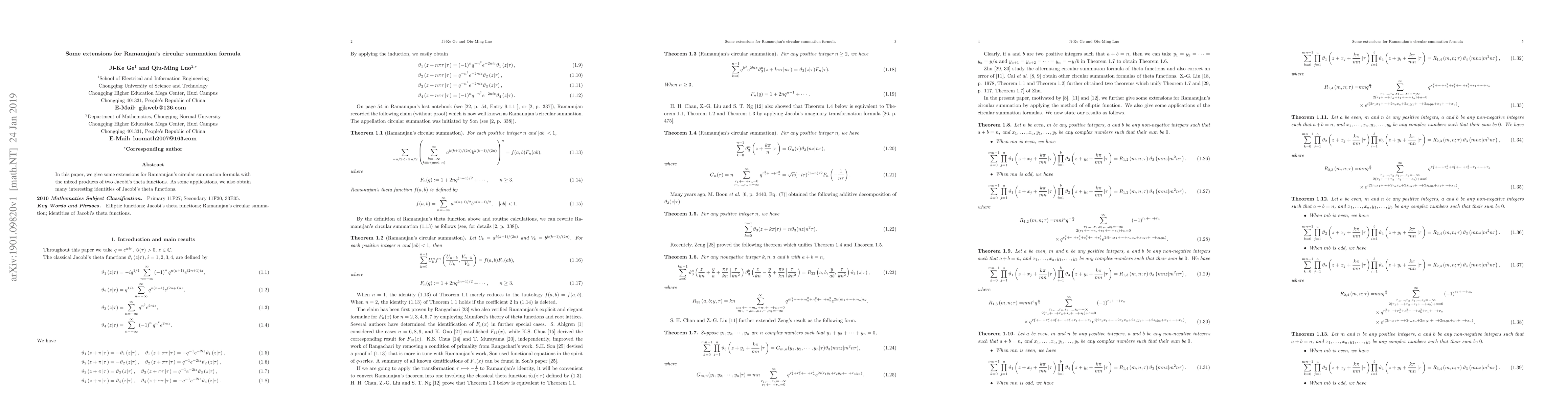 This paper extends Ramanujan's circular summation formula using the mixed products of two Jacobi's theta functions, leading to numerous new identities of these theta functions.