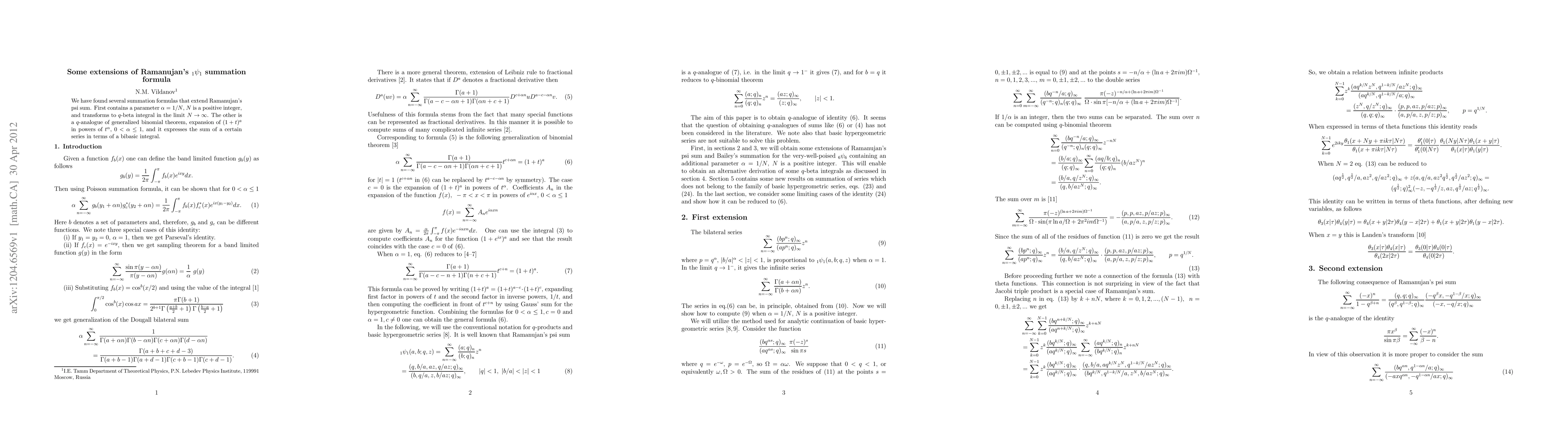 We have found several summation formulas that extend Ramanujan's psi sum. First contains a parameter $\alpha=1/N$, $N$ is a positive integer, and transforms to $q$-beta integral in the limit $N\to\infty$. The other is a $q$-analogue of generalized binomial theorem, expansion of $(1+t)^a$ in powers of $t^\alpha$, $0<\alpha\leq 1$, and it expresses the sum of a certain series in terms of a bibasic integral.