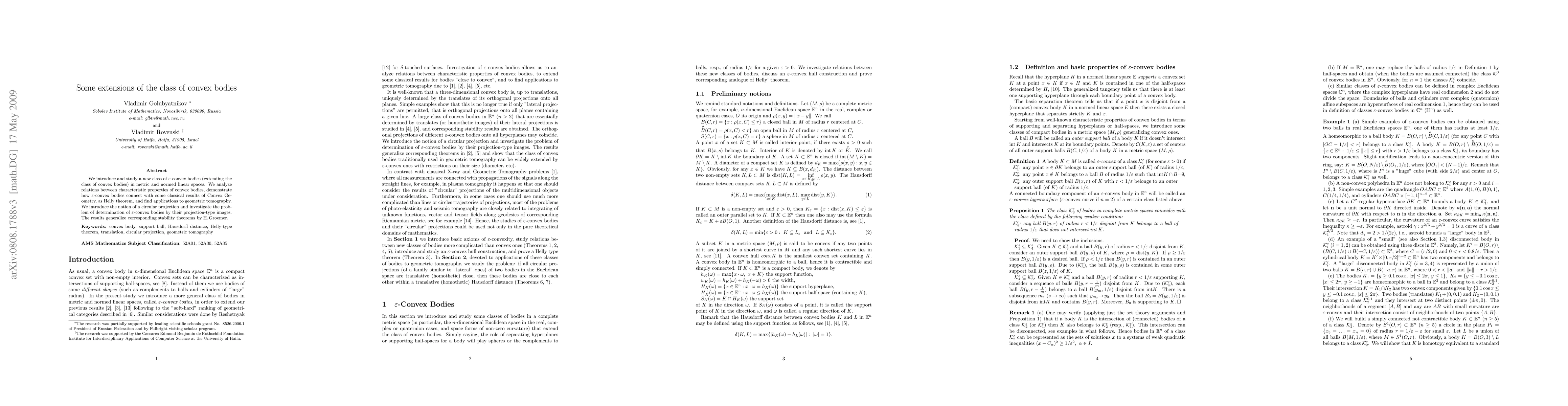 This paper introduces a new class of $\eps$-convex bodies extending traditional convex bodies in metric and normed spaces, analyzes their properties, and explores their connections to classical results like Helly's theorem. It also investigates the determination of these bodies via projection-type images and generalizes stability theorems in geometric tomography.
