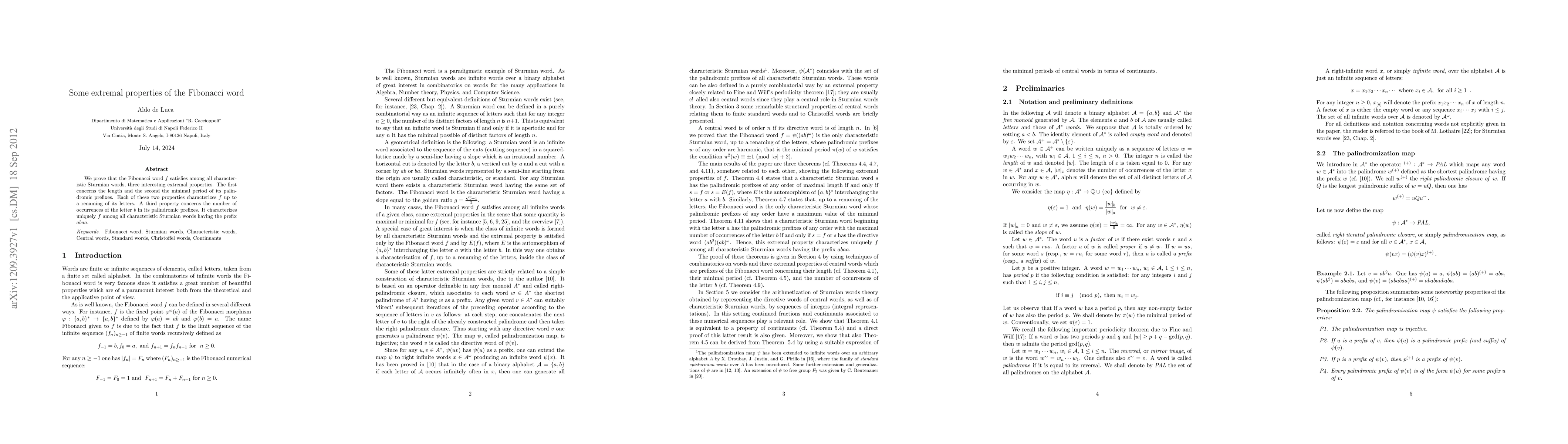 The Fibonacci word $f$ is shown to uniquely possess three extremal properties among characteristic Sturmian words: it has the longest palindromic prefixes and the smallest minimal period among such prefixes, and it uniquely counts occurrences of the letter $b$ in its palindromic prefixes when compared to other characteristic Sturmian words starting with $abaa$.