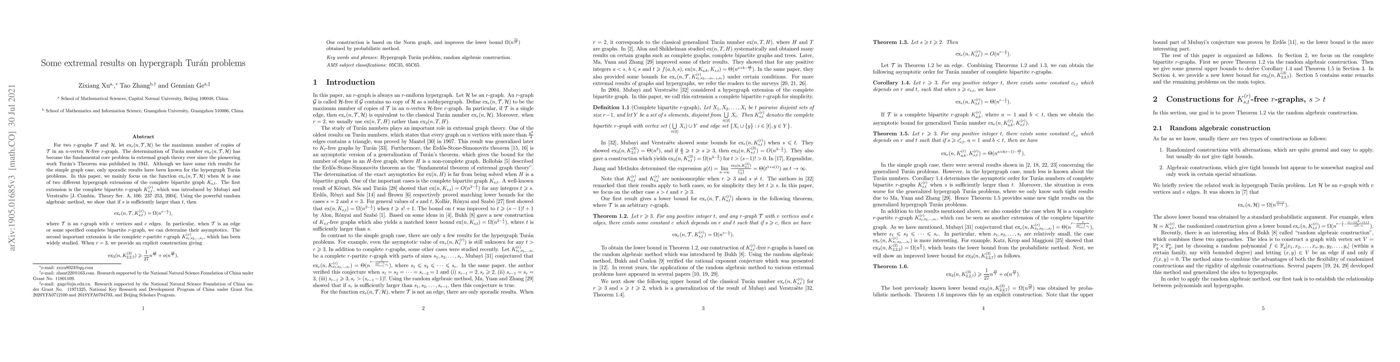 This paper explores extremal results in hypergraph Turán problems, focusing on the function $\text{ex}_{r}(n,\mathcal{T},\mathcal{H})$ for specific hypergraph extensions of the complete bipartite graph. It uses the random algebraic method to show that $\text{ex}_{r}(n,\mathcal{T},K_{s,t}^{(r)})=\Omega(n^{v-\frac{e}{t}})$ when $s$ is sufficiently larger than $t$. Additionally, it provides an explicit construction for $\text{ex}_{3}(n,K_{2,2,7}^{(3)})$, improving the lower bound.