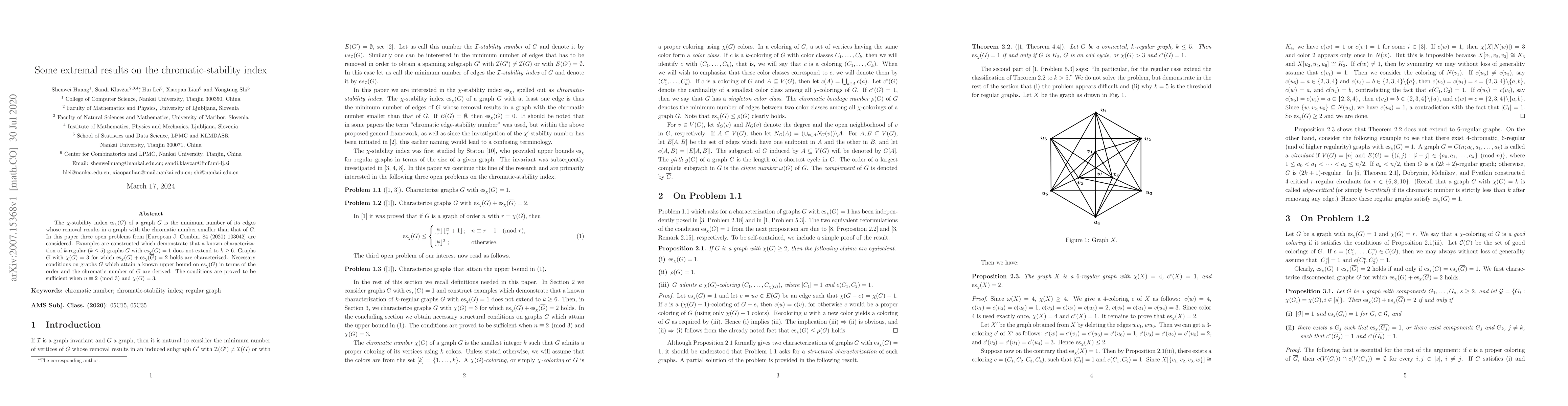 The $\chi$-stability index ${\rm es}_{\chi}(G)$ of a graph $G$ is the minimum number of its edges whose removal results in a graph with the chromatic number smaller than that of $G$. In this paper three open problems from [European J.\ Combin.\ 84 (2020) 103042] are considered. Examples are constructed which demonstrate that a known characterization of $k$-regular ($k\le 5$) graphs $G$ with ${\rm es}_{\chi}(G) = 1$ does not extend to $k\ge 6$. Graphs $G$ with $\chi(G)=3$ for which ${\rm es}_{\chi}(G)+{\rm es}_{\chi}(\overline{G}) = 2$ holds are characterized. Necessary conditions on graphs $G$ which attain a known upper bound on ${\rm es}_{\chi}(G)$ in terms of the order and the chromatic number of $G$ are derived. The conditions are proved to be sufficient when $n\equiv 2 \pmod 3$ and $\chi(G)=3$.