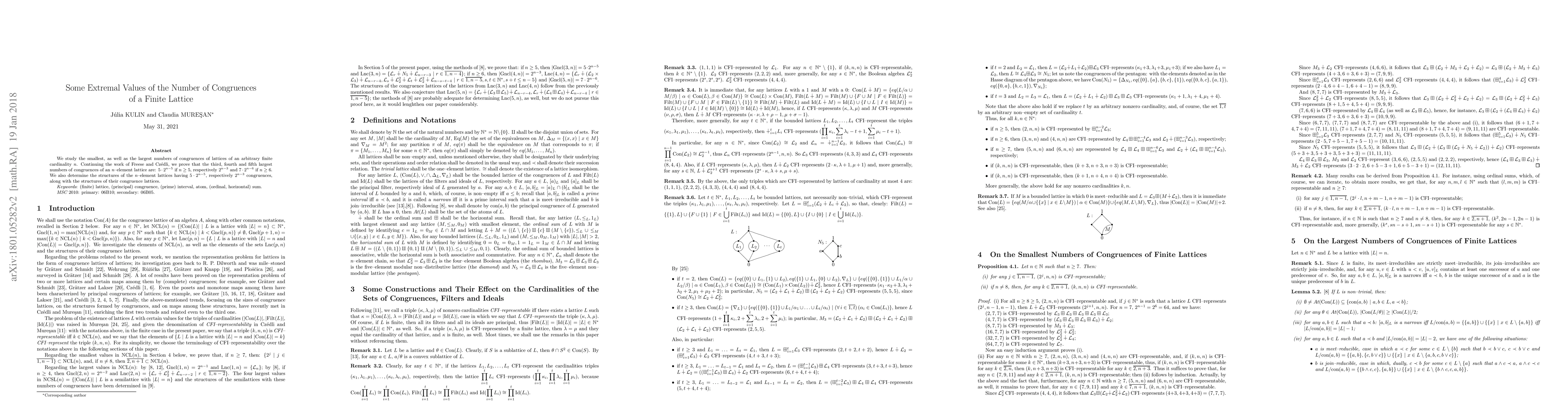 We study the smallest, as well as the largest numbers of congruences of lattices of an arbitrary finite cardinality $n$. Continuing the work of Freese and Cz\' edli, we prove that the third, fourth and fifth largest numbers of congruences of an $n$--element lattice are: $5\cdot 2^{n-5}$ if $n\geq 5$, respectively $2^{n-3}$ and $7\cdot 2^{n-6}$ if $n\geq 6$. We also determine the structures of the $n$--element lattices having $5\cdot 2^{n-5}$, respectively $2^{n-3}$ congruences, along with the structures of their congruence lattices.