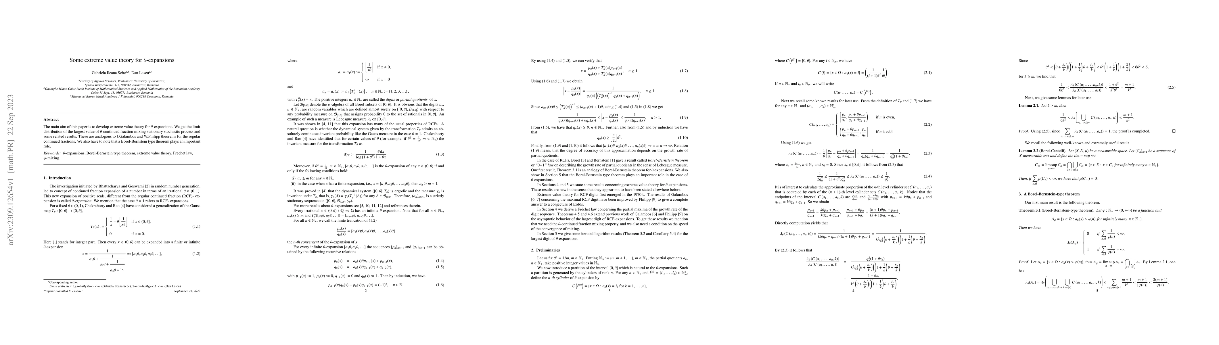 This paper develops extreme value theory for $\theta$-expansions, deriving the limit distribution of the largest value in a $\theta$-continued fraction mixing stationary stochastic process, analogous to existing theorems for regular continued fractions, with a key role played by a Borel-Bernstein type theorem.