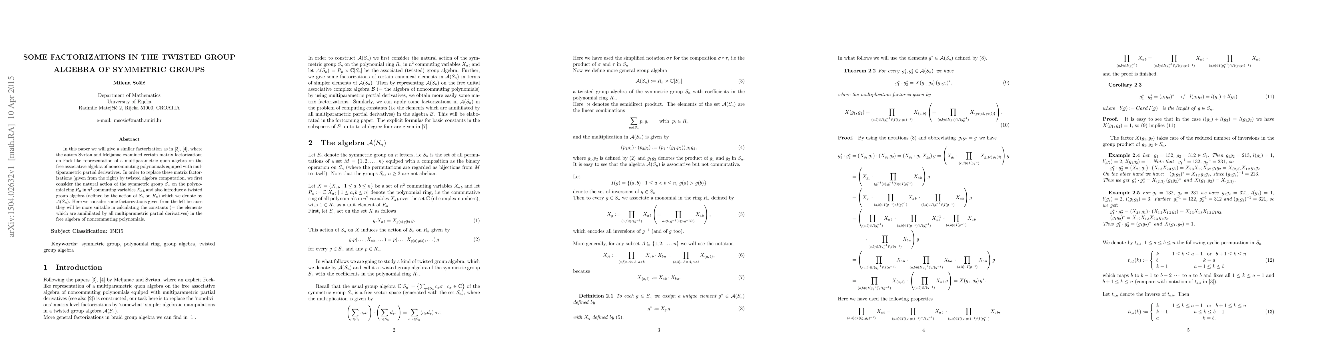 In this paper we will give a similar factorization as in \cite{4}, \cite{5}, where the autors Svrtan and Meljanac examined certain matrix factorizations on Fock-like representation of a multiparametric quon algebra on the free associative algebra of noncommuting polynomials equiped with multiparametric partial derivatives. In order to replace these matrix factorizations (given from the right) by twisted algebra computation, we first consider the natural action of the symmetric group $S_{n}$ on the polynomial ring $R_{n}$ in $n^2$ commuting variables $X_{a\,b}$ and also introduce a twisted group algebra (defined by the action of $S_{n}$ on $R_{n}$) which we denote by ${\mathcal{A}(S_{n})}$. Here we consider some factorizations given from the left because they will be more suitable in calculating the constants (= the elements which are annihilated by all multiparametric partial derivatives) in the free algebra of noncommuting polynomials.