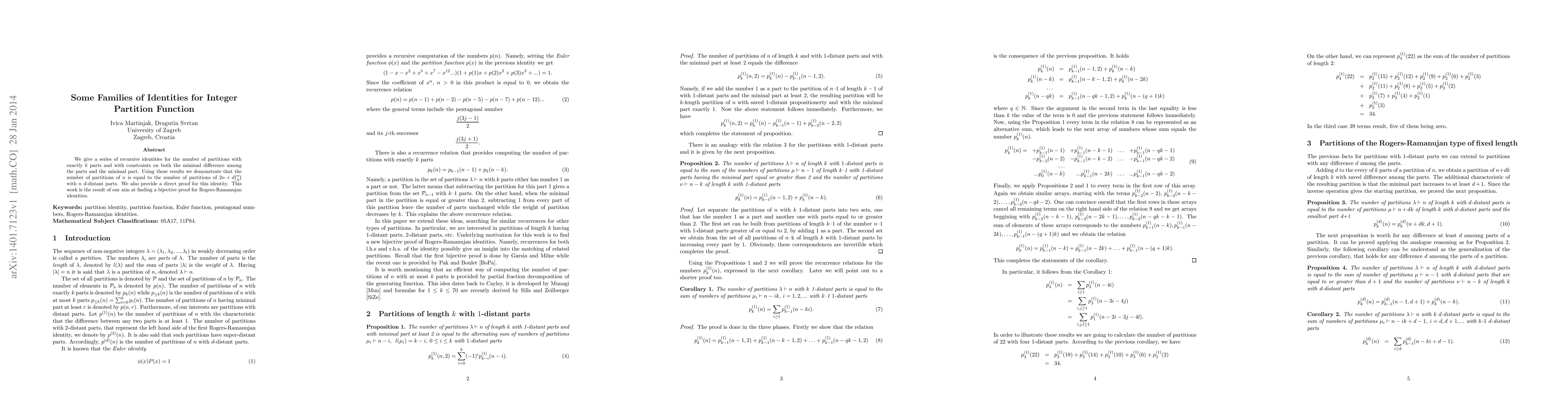 We give a series of recursive identities for the number of partitions with exactly $k$ parts and with constraints on both the minimal difference among the parts and the minimal part. Using these results we demonstrate that the number of partitions of $n$ is equal to the number of partitions of $2n+d{n \choose 2}$ with $n$ $d$-distant parts. We also provide a direct proof for this identity. This work is the result of our aim at finding a bijective proof for Rogers-Ramanujan identities.