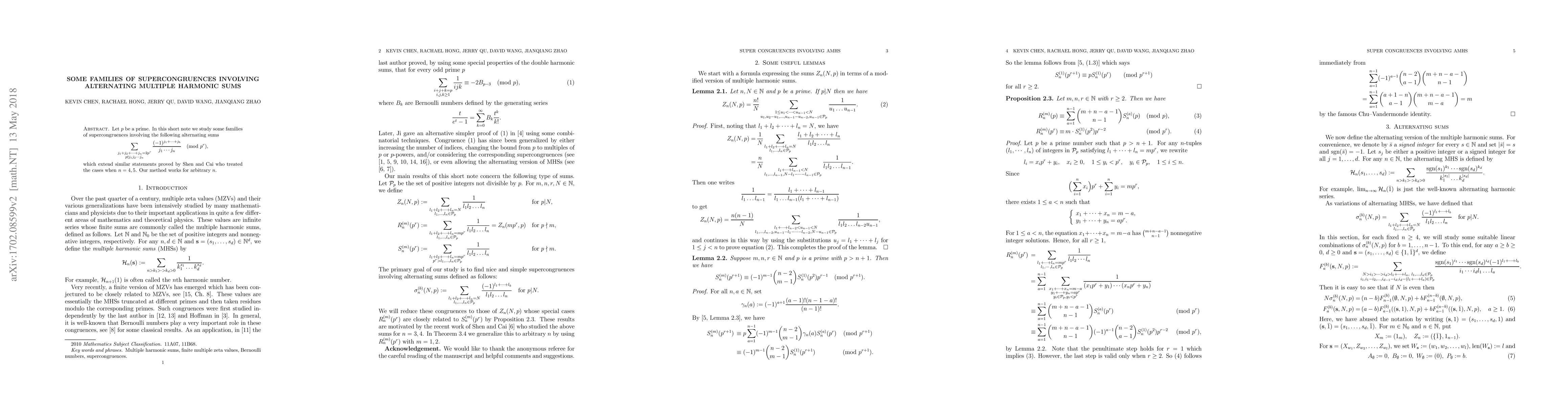 Let $p$ be a prime. In this short note we study some families of super congruences involving the following alternating sums \begin{equation*} \sum_{\substack{j_1+j_2+\cdots+j_n=2 p^r p\nmid j_1 j_2 \cdots j_n}} \frac{(-1)^{j_1+\cdots+j_b}}{j_1\cdots j_n} \pmod{p^r}, \end{equation*} which extend similar statements proved by Shen and Cai who treated the cases when $n=4,5$.