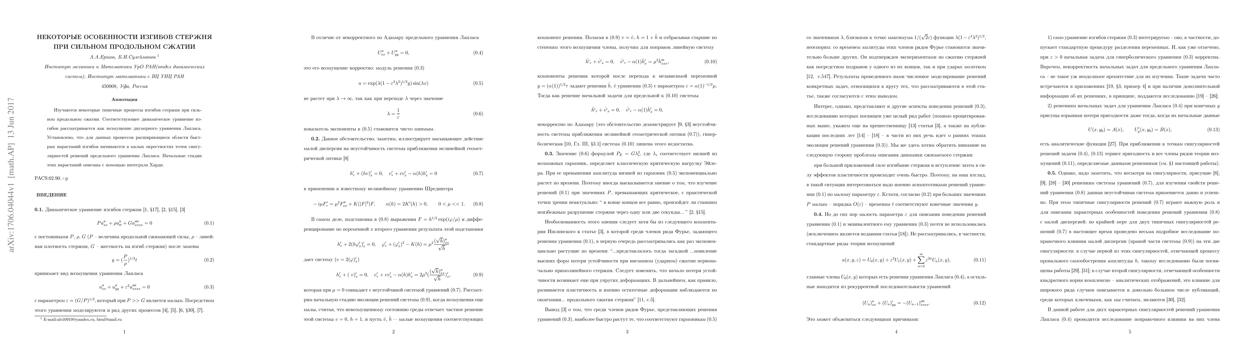 Researchers studied how a rod bends under strong compression, finding that bending begins near 'singularity points' where solutions of the limiting Laplace's equation converge. They used the Hardy integral to describe initial stages of this increase.