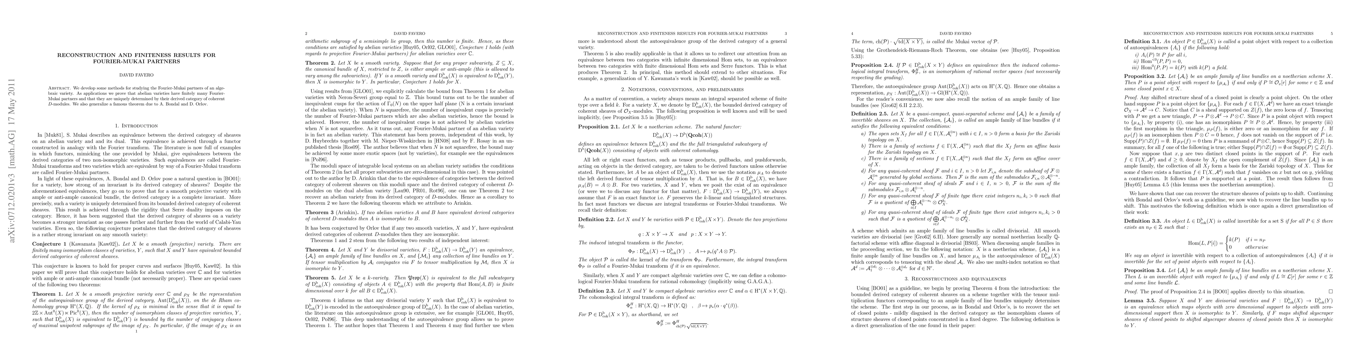This paper introduces methods for examining Fourier-Mukai partners of algebraic varieties, proving that abelian varieties have finitely many such partners uniquely determined by their derived category of coherent $D$-modules, and extending a well-known theorem by Bondal and Orlov.