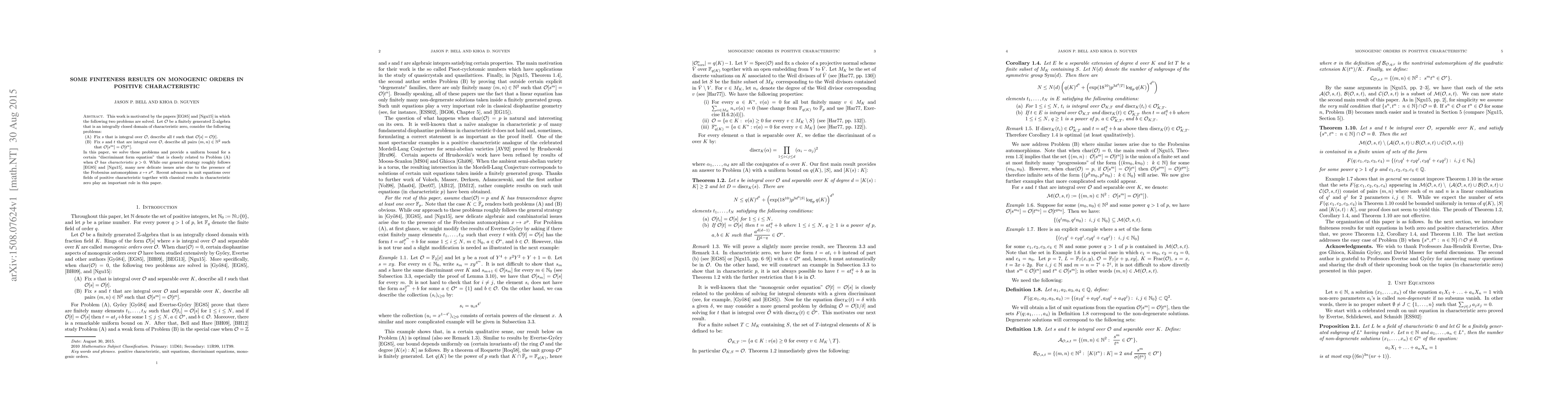 This work is motivated by the papers [EG85] and [Ngu15] in which the following two problems are solved. Let $\mathcal{O}$ is a finitely generated $\mathbb{Z}$-algebra that is an integrally closed domain of characteristic zero, consider the following problems: (A) Fix $s$ that is integral over $\mathcal{O}$, describe all $t$ such that $\mathcal{O}[s]=\mathcal{O}[t]$. (B) Fix $s$ and $t$ that are integral over $\mathcal{O}$, describe all pairs $(m,n)\in\mathbb{N}^2$ such that $\mathcal{O}[s^m]=\mathcal{O}[t^n]$. In this paper, we solve these problems and provide a uniform bound for a certain "discriminant form equation" that is closely related to Problem (A) when $\mathcal{O}$ has characteristic $p>0$. While our general strategy roughly follows [EG85] and [Ngu15], many new delicate issues arise due to the presence of the Frobenius automorphisms $x\mapsto x^p$. Recent advances in unit equations over fields of positive characteristic together with classical results in characteristic zero play an important role in this paper.