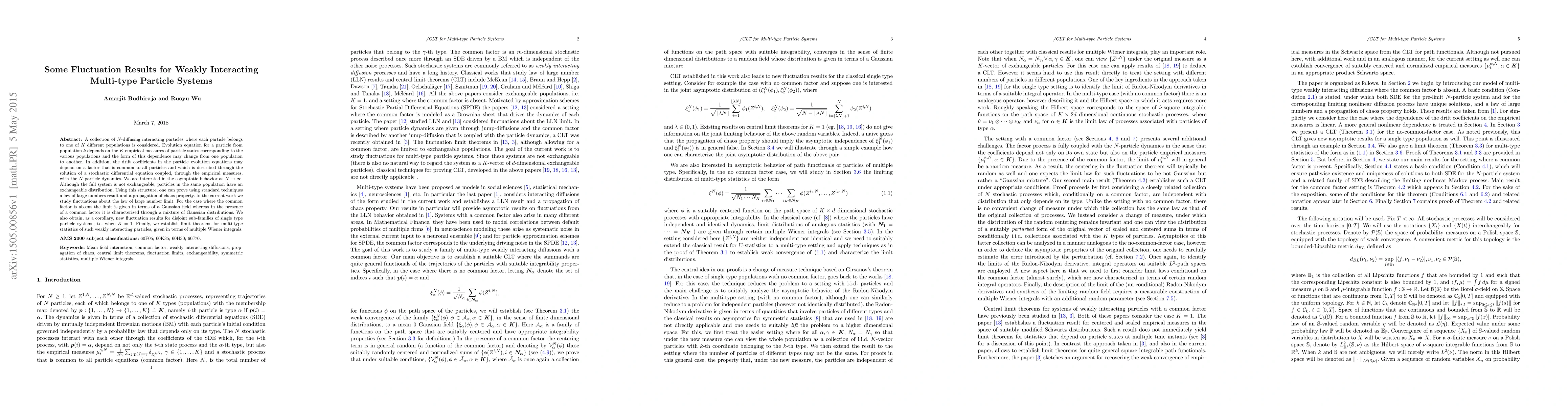 A collection of $N$-diffusing interacting particles where each particle belongs to one of $K$ different populations is considered. Evolution equation for a particle from population $k$ depends on the $K$ empirical measures of particle states corresponding to the various populations and the form of this dependence may change from one population to another. In addition, the drift coefficients in the particle evolution equations may depend on a factor that is common to all particles and which is described through the solution of a stochastic differential equation coupled, through the empirical measures, with the $N$-particle dynamics. We are interested in the asymptotic behavior as $N\to \infty$. Although the full system is not exchangeable, particles in the same population have an exchangeable distribution. Using this structure, one can prove using standard techniques a law of large numbers result and a propagation of chaos property. In the current work we study fluctuations about the law of large number limit. For the case where the common factor is absent the limit is given in terms of a Gaussian field whereas in the presence of a common factor it is characterized through a mixture of Gaussian distributions. We also obtain, as a corollary, new fluctuation results for disjoint sub-families of single type particle systems, i.e. when $K=1$. Finally, we establish limit theorems for multi-type statistics of such weakly interacting particles, given in terms of multiple Wiener integrals.