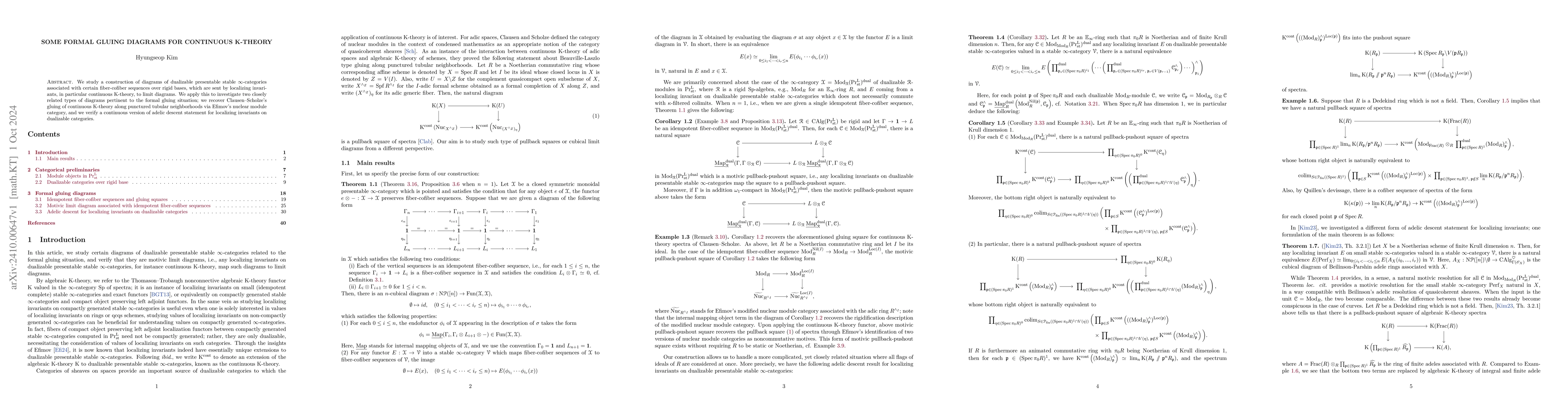 This paper constructs diagrams for dualizable presentable stable $\infty$-categories linked to fiber-cofiber sequences, showing their relevance to continuous K-theory. It recovers Clausen--Scholze's K-theory gluing results and verifies a continuous version of adelic descent for localizing invariants.