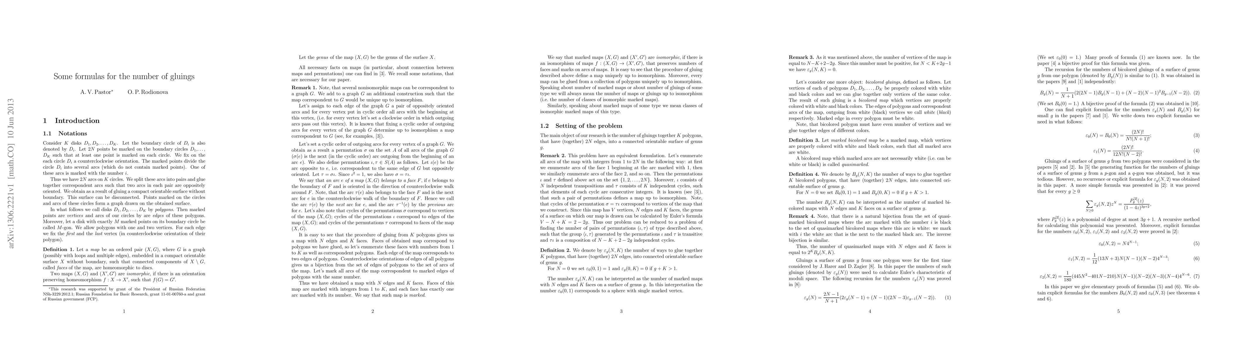 In this paper the number of ways to glue a surface of genus $g$ has been investigated. We've proven formulas for the number of gluings sphere from three polygons and from two bicolored polygons. Moreover, we've given a new proofs on the formulas for the number of gluings sphere and torus from two polygons.
