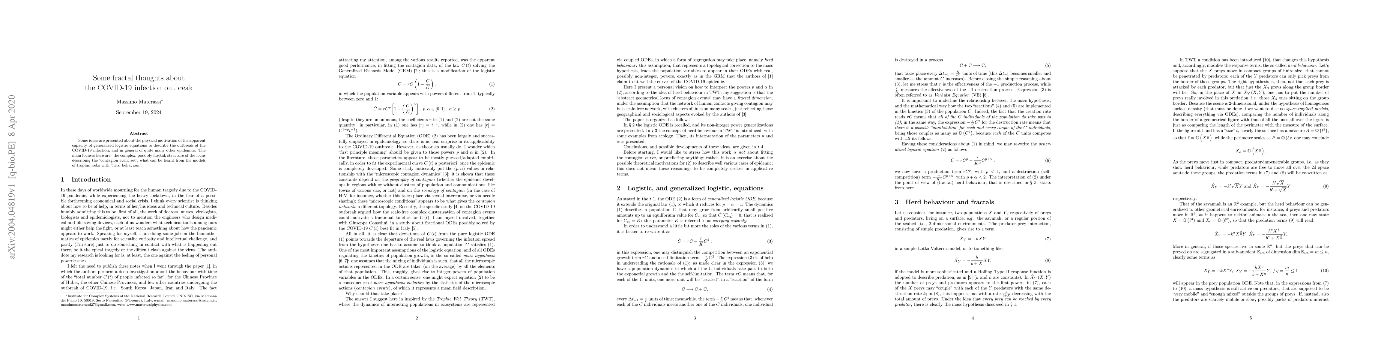 Some ideas are presented about the physical motivation of the apparent capacity of generalized logistic equations to describe the outbreak of the COVID-19 infection, and in general of quite many other epidemics. The main focuses here are: the complex, possibly fractal, structure of the locus describing the "contagion event set"; what can be learnt from the models of trophic webs with "herd behaviour".